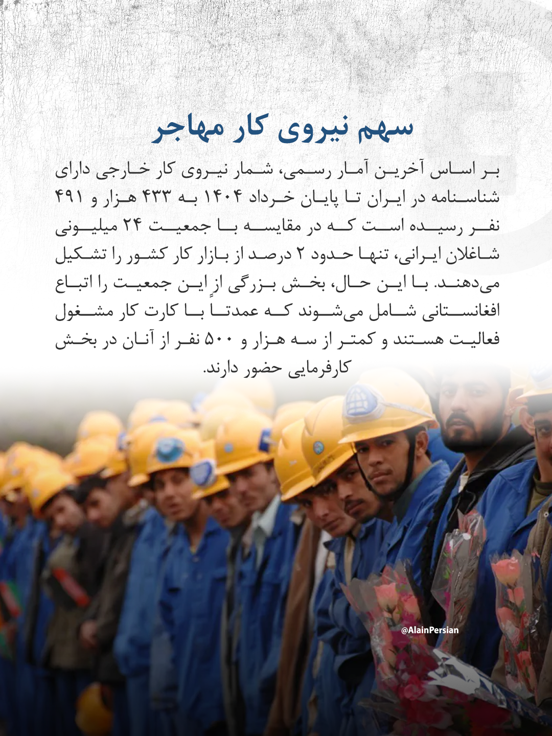 بر اساس آخرین آمار رسمی، شمار نیروی کار خارجی دارای شناسنامه در ایران تا پایان خرداد ١٤٠٤ به ٤٣٣ هزار و ٤٩١ نفر رسیده است که در مقایسه با جمعیت ٢٤ میلیونی شاغلان ایرانی، تنها حدود ٢ درصد از بازار کار کشور را تشکیل میدهند. با این حال، بخش بزرگی از این جمعیت را اتباع افغانستانی شامل میشوند که عمدتاً با کارت کار مشغول فعالیت هستند و کمتر از سه هزار و ٥٠٠ نفر از آنان در بخش کارفرمایی حضور دارند.
