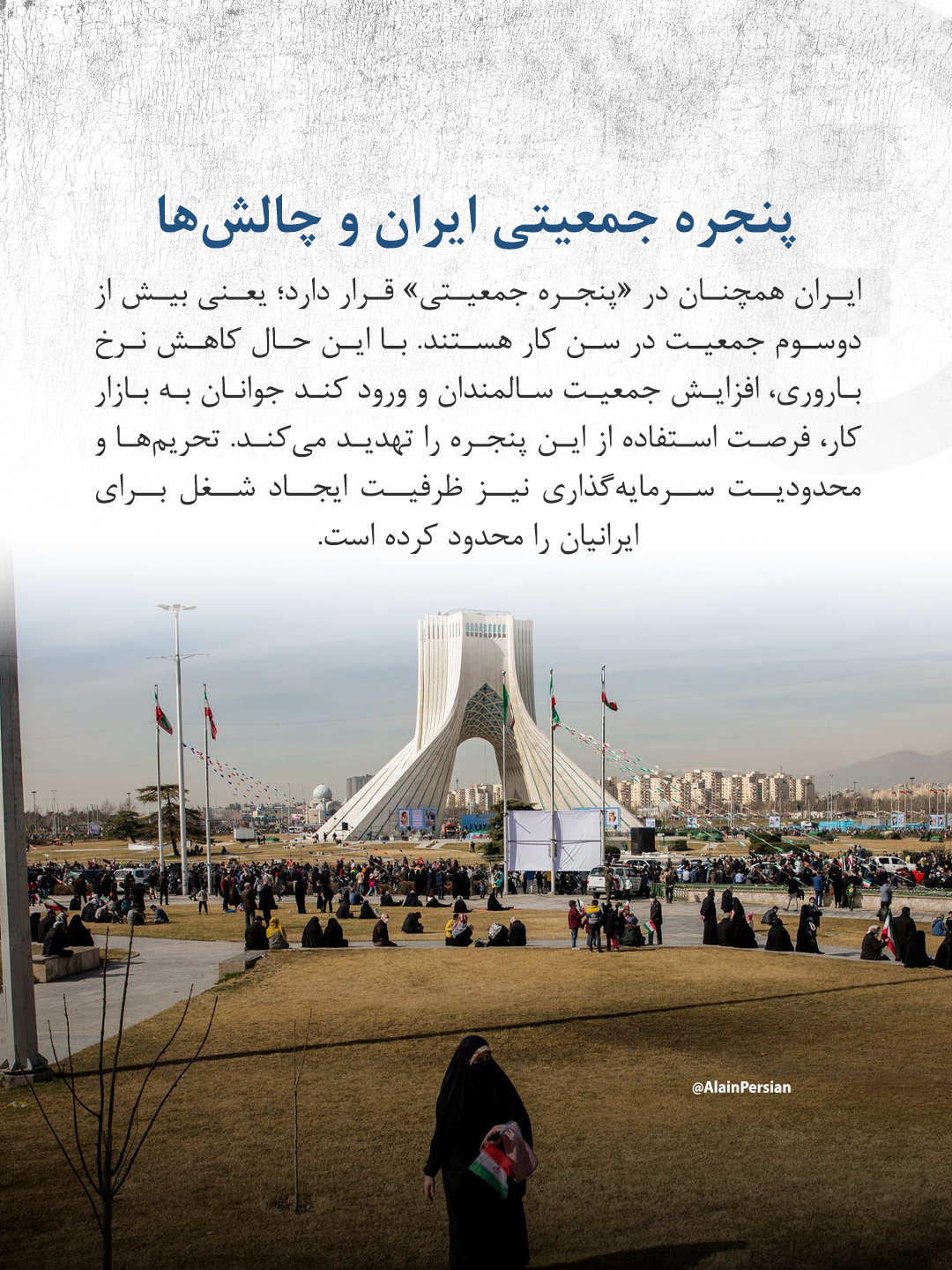 در گزارش مرکز پژوهشهای اتاق بازرگانی نیز آمده است که ایران همچنان در «پنجره جمعیتی» قرار دارد؛ دورهای که بیش از دوسوم جمعیت در سن کار هستند. این فرصت میتواند موتور رشد اقتصادی باشد، اما کاهش نرخ باروری، افزایش سهم سالمندان و ورود کند جوانان به بازار کار، آینده این پنجره را مبهم کرده است. همزمان محدودیتهای سرمایهگذاری و اثر تحریمها، ظرفیت ایجاد شغل برای نیروی بومی را کاهش داده و موجب شده بخشی از متولدین دهه ٦٠ بدون دسترسی به شغل پایدار و بیمه بازنشستگی به میانسالی برسند.