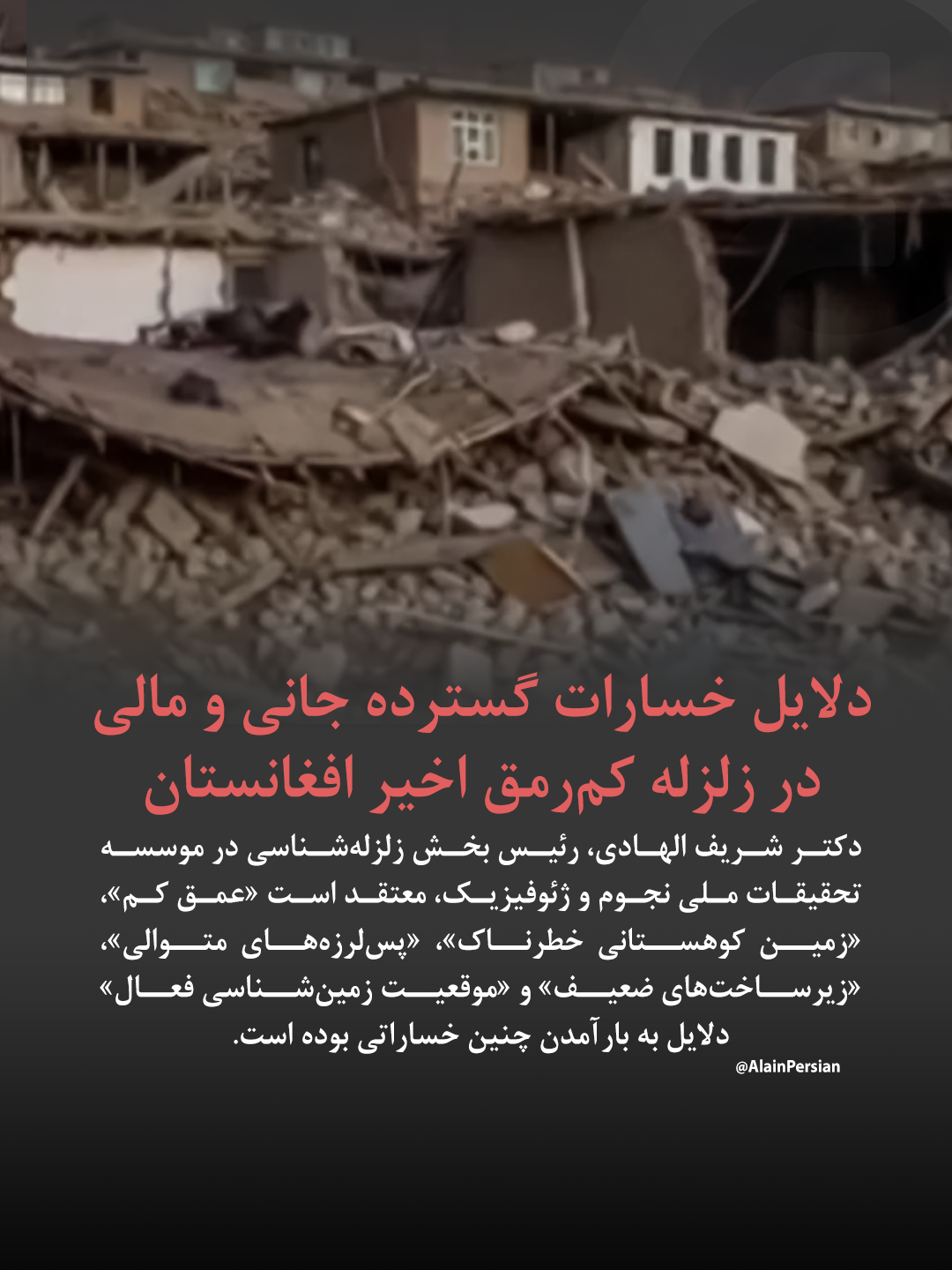 الهادی در پایان با دلیل پنجم میگوید: «موقعیت زمینشناسی فعال». افغانستان در محل اتصال صفحات هند و اوراسیا قرار دارد، منطقهای لرزهخیز که در سالهای اخیر شاهد چندین زلزله ویرانگر بوده است، از جمله زلزله ۲۰۲۲ که نزدیک به ۱۰۰۰ نفر را کشت و زلزله ۲۰۲۳ هرات که جان بیش از ۱۵۰۰ نفر را گرفت.