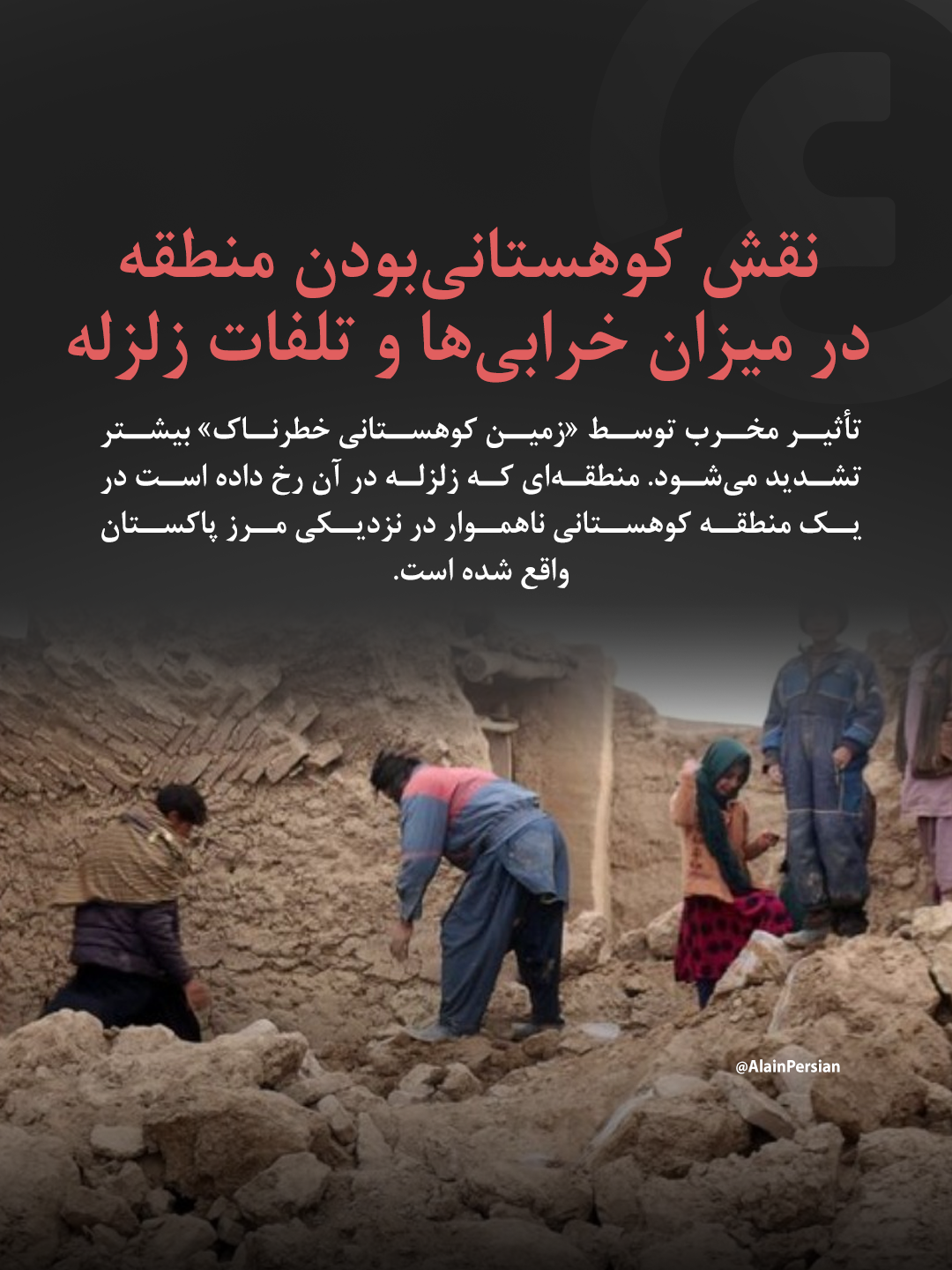 تأثیر مخرب توسط «زمین کوهستانی خطرناک» بیشتر تشدید میشود. منطقهای که زلزله در آن رخ داده است در یک منطقه کوهستانی ناهموار در نزدیکی مرز پاکستان واقع شده است. الهادی توضیح داد که این زمین، روستاها را منزوی و دسترسی به آنها را دشوار میکند و آنها در برابر رانش زمین بسیار آسیبپذیر هستند که باعث افزایش تلفات و مانع عملیات نجات میشود.