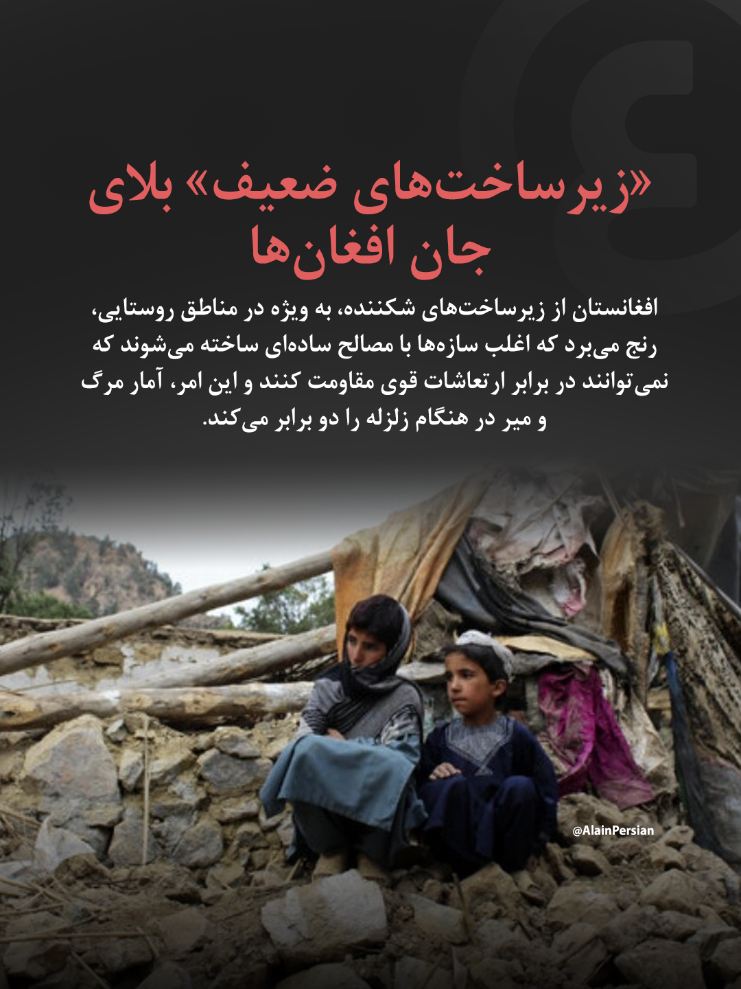 این سه دلیل با «زیرساختهای ضعیف» همراه هستند. افغانستان از زیرساختهای شکننده، به ویژه در مناطق روستایی، رنج میبرد. ساختمانها در روستاهای کوهستانی اغلب با مصالح سادهای ساخته میشوند که نمیتوانند در برابر ارتعاشات قوی مقاومت کنند، که این امر آمار مرگ و میر در هنگام زلزله را دو برابر میکند.