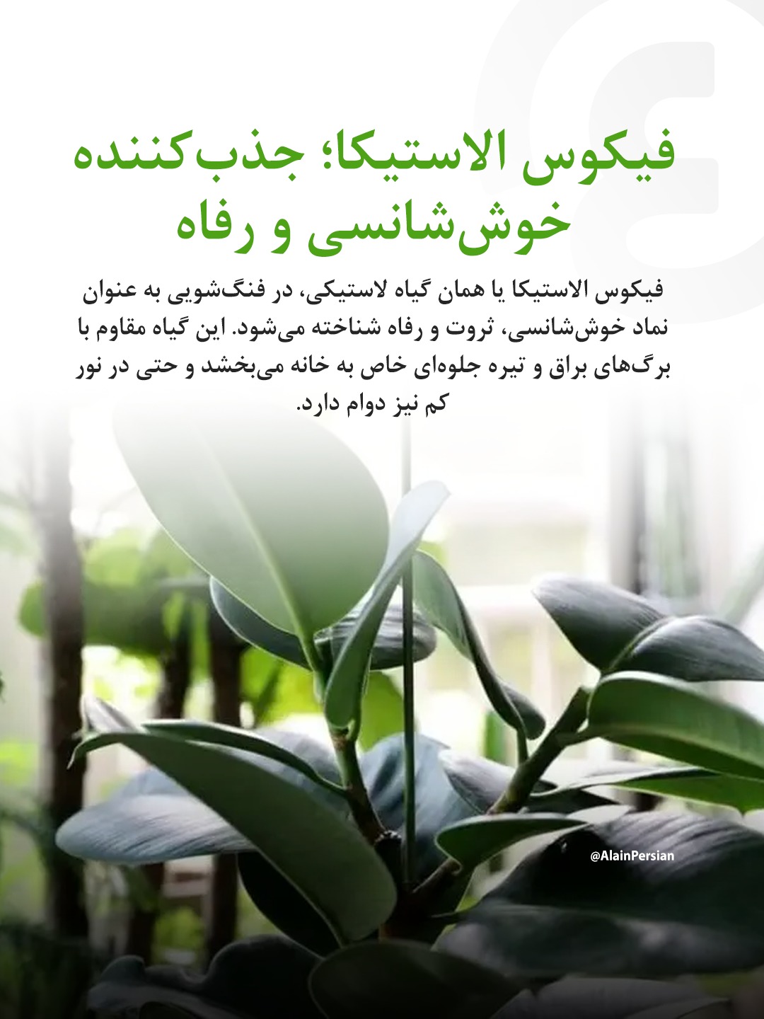 نخستین گیاه فیکوس الاستیکا یا همان گیاه لاستیکی است. این گیاه با برگهای براق و تیره خود جلوهای خاص به خانه میدهد و در فنگشویی به عنوان جاذب خوششانسی و رفاه شناخته میشود. فیکوس الاستیکا گیاهی مقاوم است که حتی در محیطهای کمنور نیز رشد میکند و قرار دادن آن در مکانی بلند و بدون مانع میتواند انرژی مثبت بیشتری به محیط بیاورد.