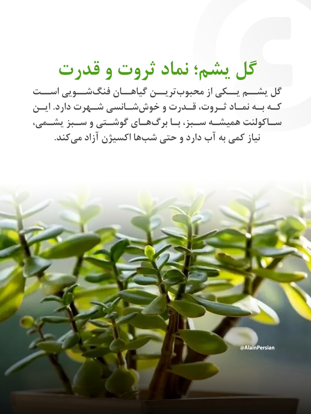 گیاه دوم گل یشم است که یکی از محبوبترین گیاهان آپارتمانی به شمار میآید. این گیاه به نماد ثروت، قدرت و خوششانسی شهرت دارد. گل یشم یک ساکولنت همیشه سبز است که برگهای گوشتی و سبز یشمی دارد و به آب کم و نور غیرمستقیم نیازمند است. ویژگی دیگر این گیاه آزادسازی اکسیژن در شب است که به داشتن خوابی آرام کمک میکند.