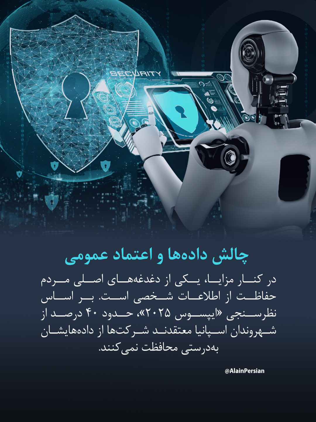 با این حال، نگرانیها درباره استفاده شرکتها از دادههای شخصی همچنان ادامه دارد. طبق گزارش «مانیتور هوش مصنوعی ایپسوس ۲۰۲۵»، حدود ۴۰ درصد از شهروندان اسپانیا بر این باورند که شرکتها از اطلاعات آنان بهدرستی محافظت نمیکنند. خاویر مالو، مدیر فناوری کارفور، گفت: «بدون اشتراکگذاری دادهها پیشرفتی حاصل نمیشود، اما در عین حال هیچکس نمیتواند امنیت صددرصدی را تضمین کند.»