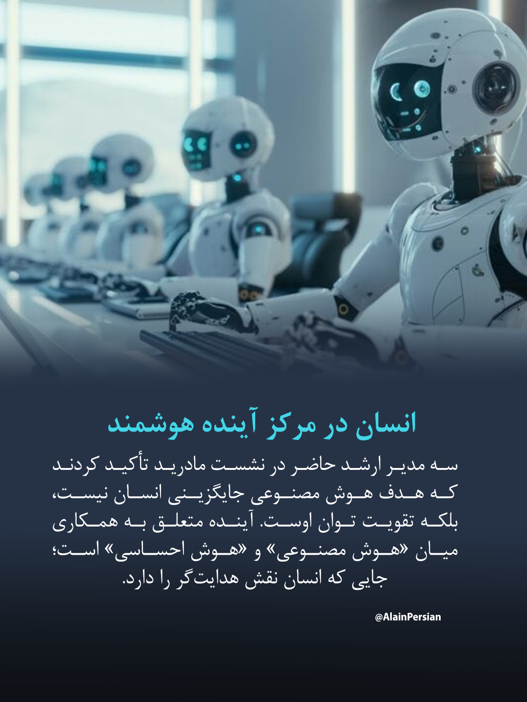در پایان نشست، از حاضران پرسیده شد که هوش مصنوعی هرگز چه کاری نمیتواند انجام دهد. پاسخ همه یکسان بود: «ابراز احساسات، همدلی و رهبری.» رافائل سان خوآن از ایبردرولا گفت: «هوش مصنوعی میتواند تاج محل را بسازد، اما نمیفهمد عشق سازنده آن به چه معناست.»