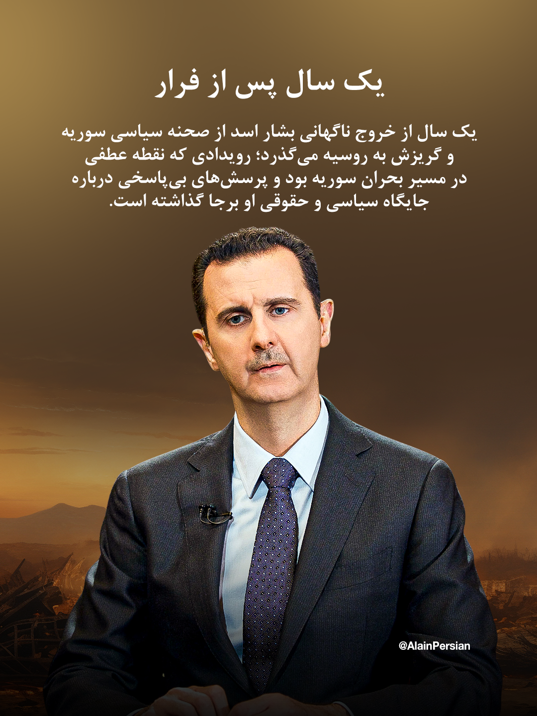 یک سال از زمانی که بشار اسد، رئیسجمهوری سابق سوریه، در اوج تحولات سیاسی این کشور بهطور ناگهانی از صحنه کنار رفت و در شرایطی پرابهام به روسیه گریخت، گذشته است. اما پس از یک سال پرونده او به کجا رسیده است؟