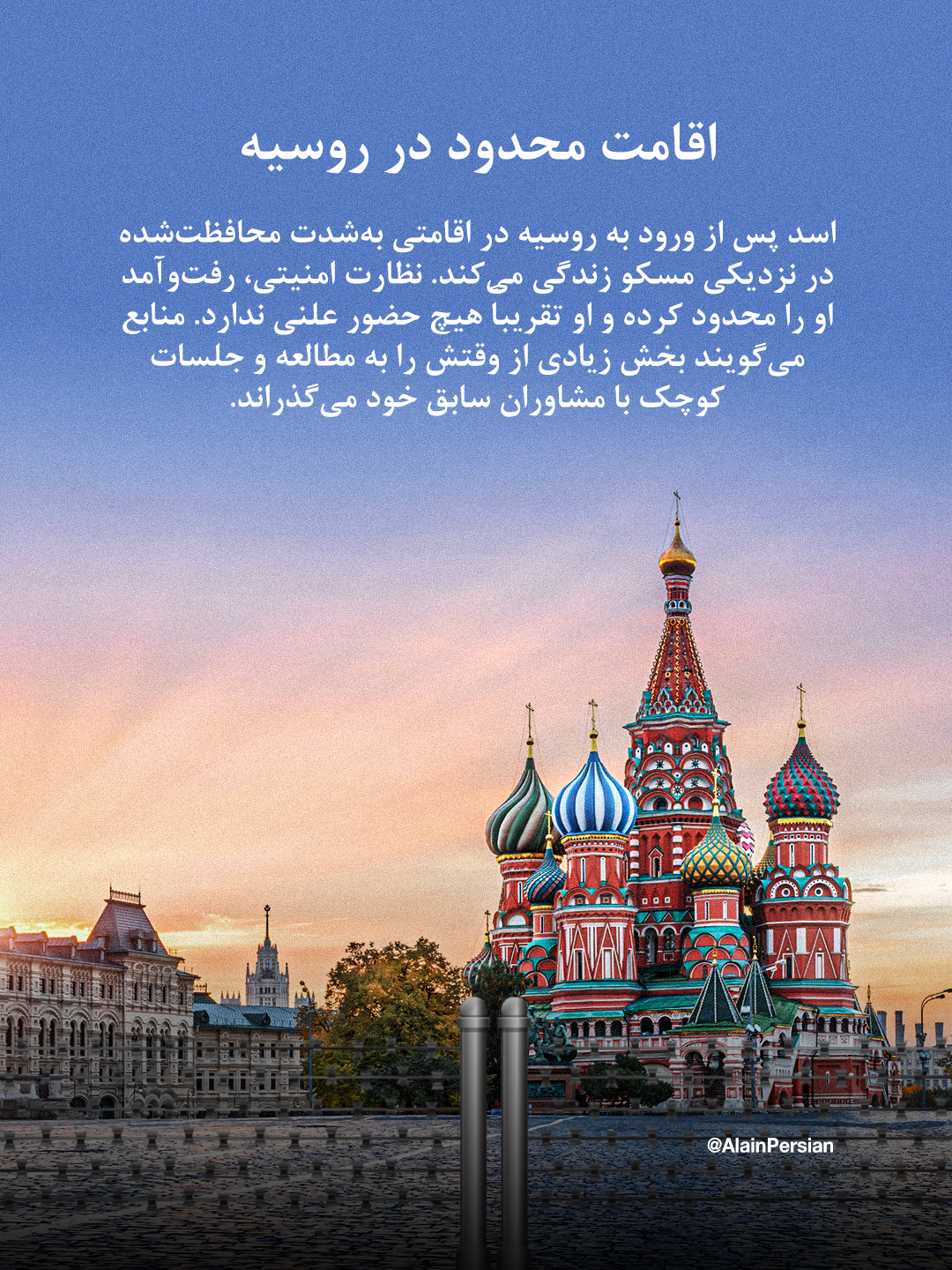 اسد پس از ورود به روسیه در اقامتی بهشدت کنترلشده در حاشیه مسکو زندگی میکند. تدابیر امنیتی سختگیرانه، رفتوآمد او را محدود کرده و او تقریباً هیچ حضور علنی، گفتوگو یا بیانیه رسمی نداشته است. منابع آگاه میگویند اسد بیشتر وقت خود را صرف مطالعه و پیگیری تحولات سوریه از طریق جلسات کوچک و محرمانه با معدود مشاوران سابق خود میکند؛ افرادی که روسیه اجازه داده است همچنان در کنار او باقی بمانند. این شرایط عملاً او را از میدان سیاست داخلی و خارجی دور کرده و نوعی انزوای اجباری برای او رقم زده است.