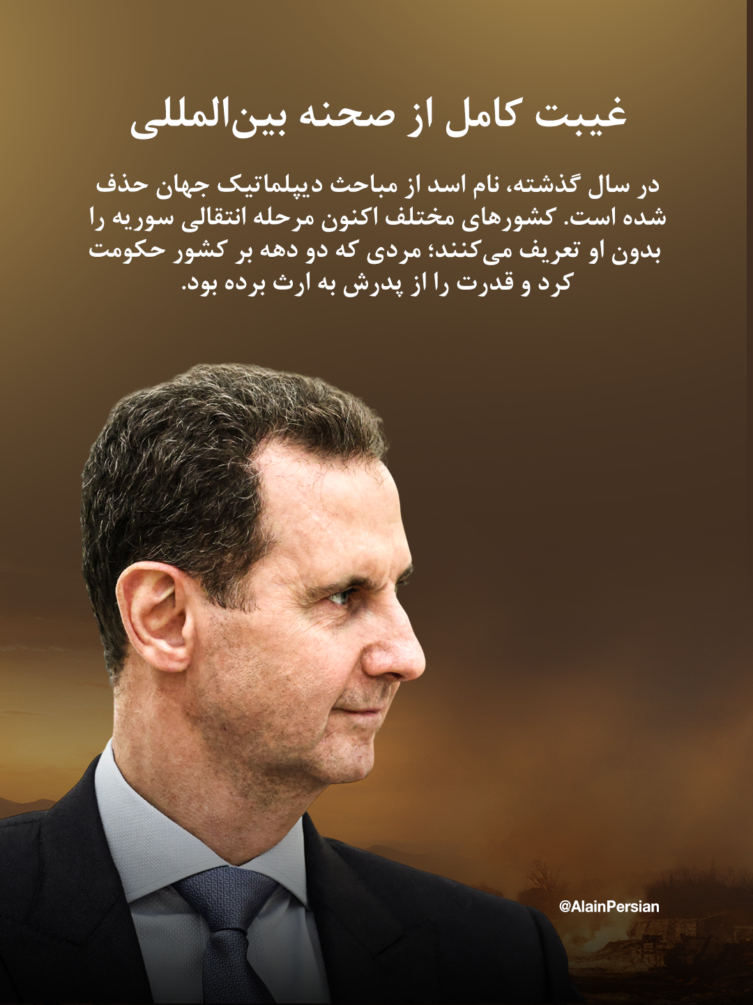 در عرصه بینالمللی نیز نام اسد تقریباً از تمامی گفتوگوهای دیپلماتیک حذف شده است. کشورهای مختلف اکنون دوران گذار سوریه را بدون اسد تصور میکنند؛ شخصی که دو دهه قدرت را در دمشق در اختیار داشت و پس از مرگ حافظ اسد، پدرش، اداره کشور را بهدست گرفته بود. در ساختار جدید روابط منطقهای و روند گفتوگوها درباره آینده سوریه، جایگاهی برای او دیده نمیشود و به نظر میرسد بازیگران مؤثر تمایلی به بازگرداندن نقش سیاسی او ندارند.