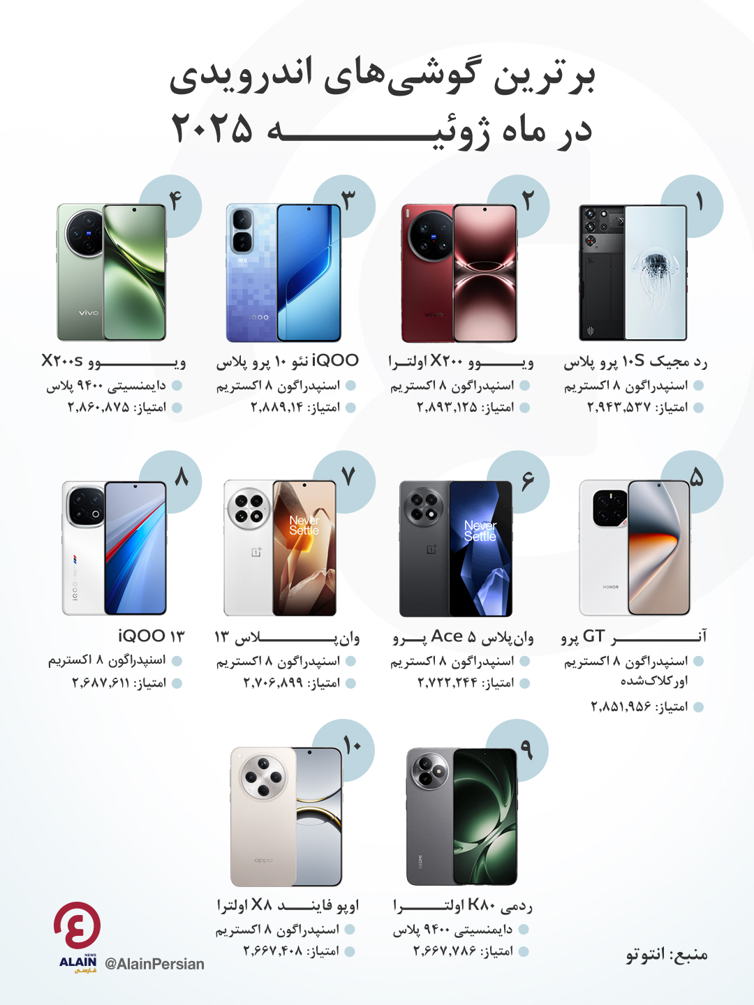 جدیدترین فهرست گوشیهای پرچمدار و میانرده اندرویدی از سوی بنچمارک آنتوتو برای ماه ژوئیه سال ۲۰۲۵ اعلام شد.