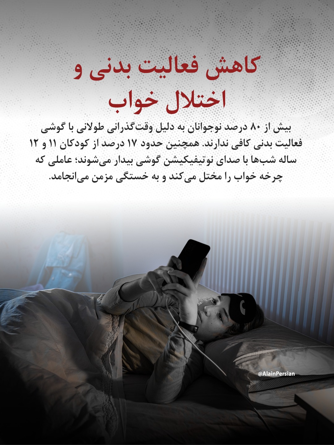 در این مطالعه آمده است که بیش از ۸۰ درصد نوجوانان به علت استفاده طولانیمدت از گوشی، فعالیت بدنی کافی ندارند. همچنین نزدیک به ۱۷ درصد از کودکان ۱۱ و ۱۲ ساله شبها با صدای نوتیفیکیشن گوشی از خواب بلند میشوند، مسئلهای که چرخه خواب را به هم میزند و خستگی روزانه را افزایش میدهد.