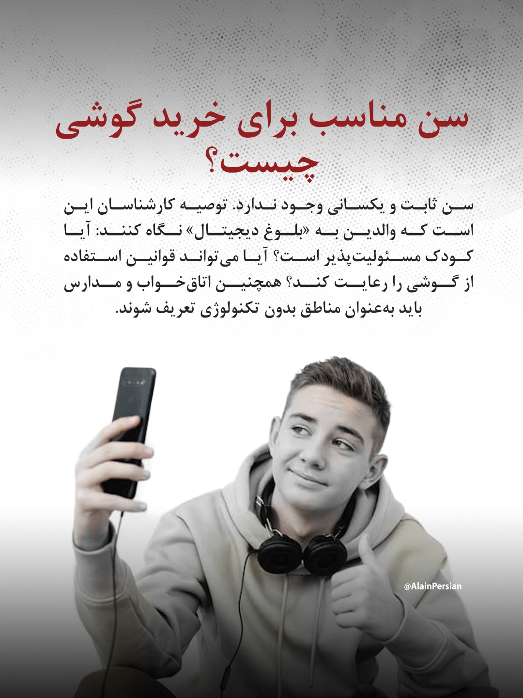 کارشناسان معتقدند سن یکنواخت و مشخصی برای خرید گوشی وجود ندارد، اما والدین باید ارزیابی کنند که کودک چقدر توانایی رعایت قوانین استفاده از موبایل را دارد. آنها همچنین توصیه میکنند اتاقخوابها و محیط مدرسه باید بهعنوان ناحیههای بدون تکنولوژی معرفی شوند تا از فشارهای مداوم دیجیتال بر کودکان کاسته شود.