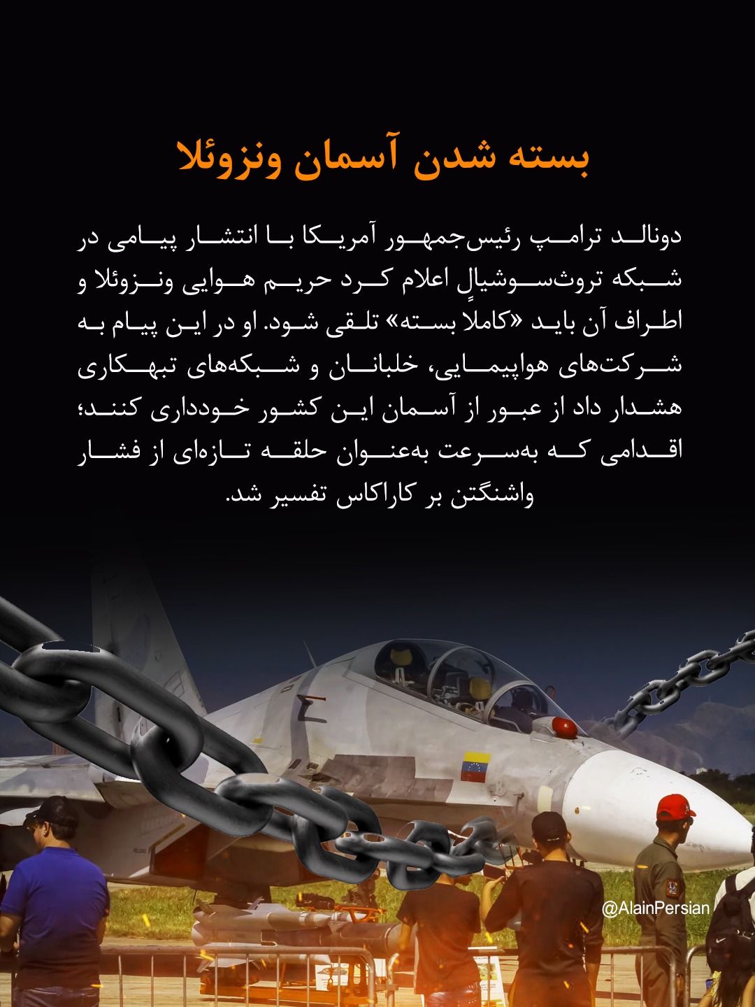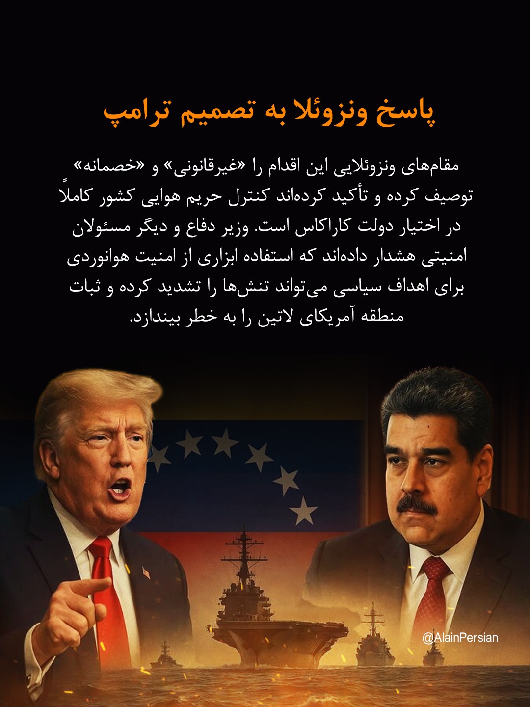 این واکنش پس از آن مطرح شد که ترامپ در پیامی در شبکه «تروث سوشیال» نوشته بود «حریم هوایی ونزوئلا و اطراف آن باید بهطور کامل بسته تلقی شود».