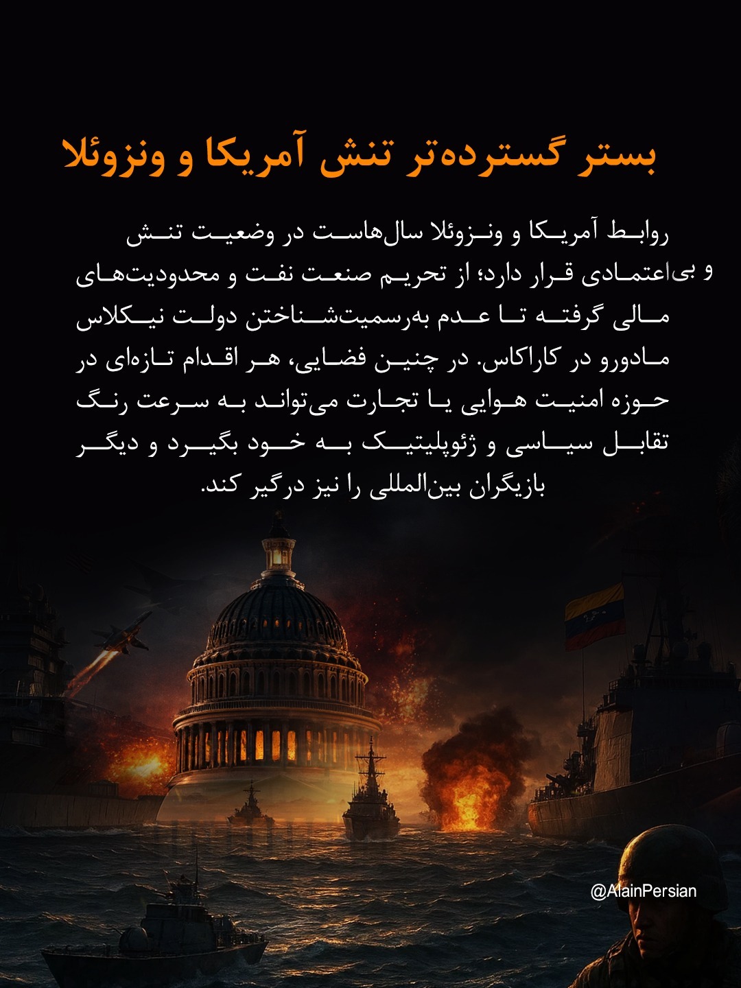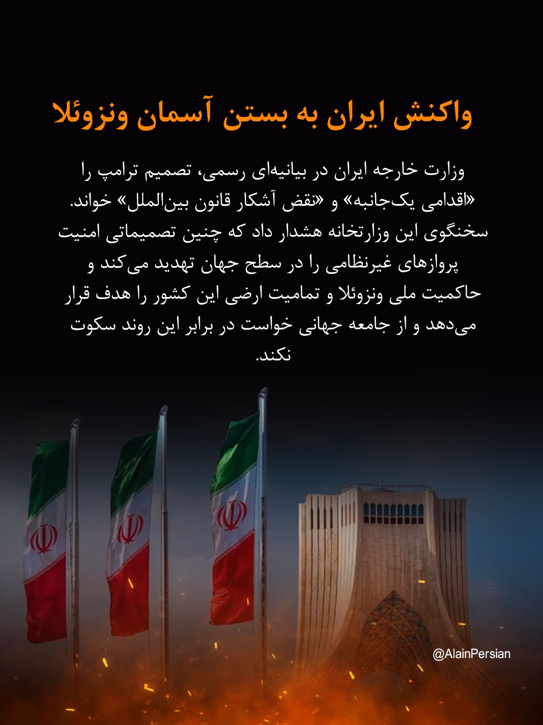 وزارت امور خارجه ایران در بیانیهای تصمیم دونالد ترامپ، رئیسجمهوری آمریکا، مبنی بر «بستهشدن کامل» حریم هوایی ونزوئلا را محکوم کرد و آن را اقدامی یکجانبه و برخلاف اصول پذیرفتهشده بینالمللی دانست.