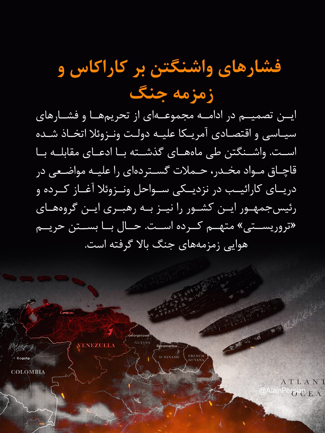 این اظهارات در حالی بیان میشود که دولت آمریکا از روز شنبه فشارهای خود بر ونزوئلا را افزایش داده است. ترامپ در پیامی خطاب به شرکتهای هواپیمایی، خلبانان و گروههای تبهکاری هشدار داده که باید از حریم هوایی ونزوئلا دوری کنند. این پیام بخشی از سیاستهای واشنگتن برای منزویسازی دولت کاراکاس توصیف شده است.