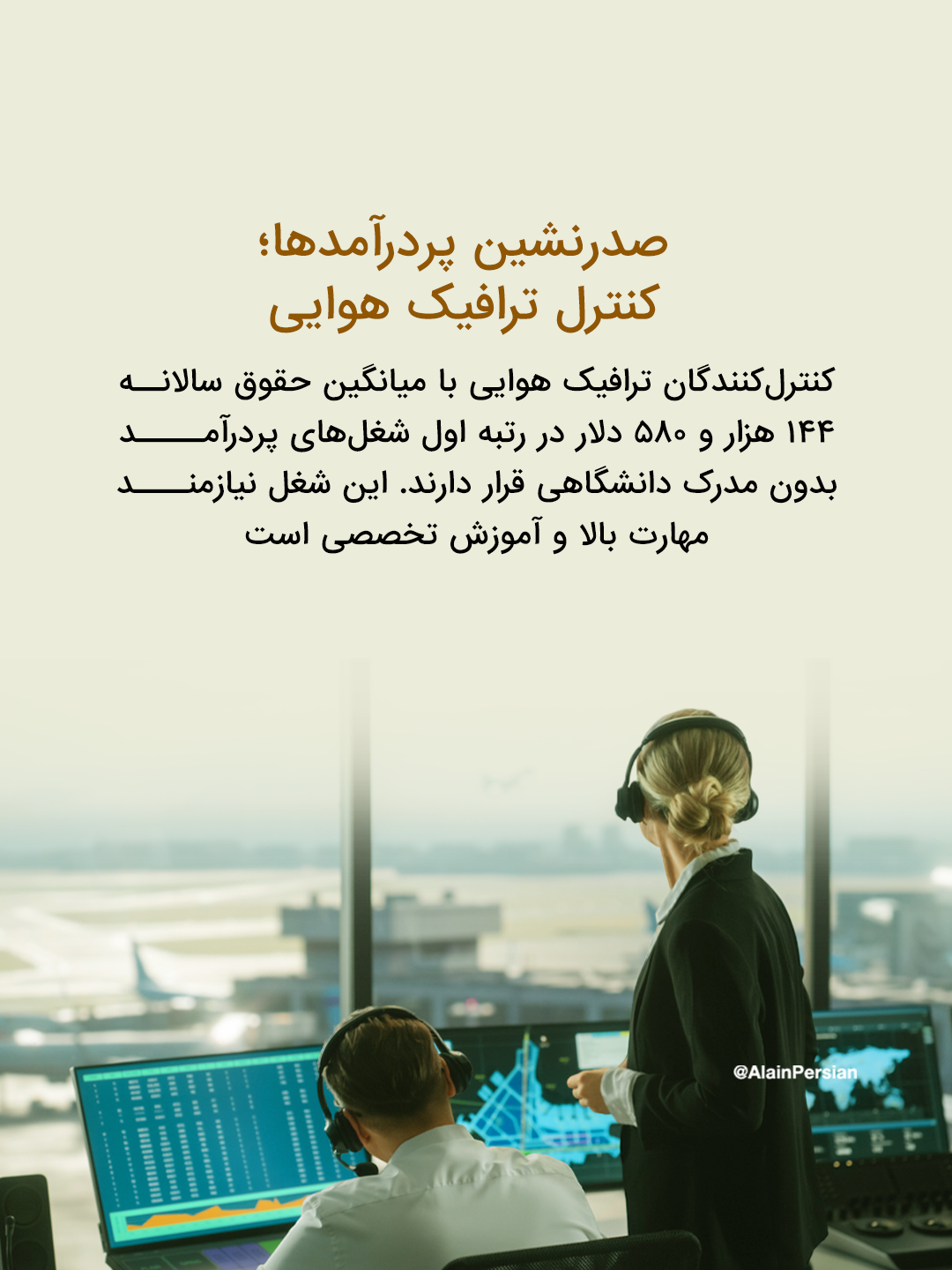 بر اساس این دادهها، کنترلکنندگان ترافیک هوایی با میانگین دستمزد سالانه ۱۴۴ هزار و ۵۸۰ دلار در صدر فهرست مشاغل غیر دانشگاهی پردرآمد قرار دارند.