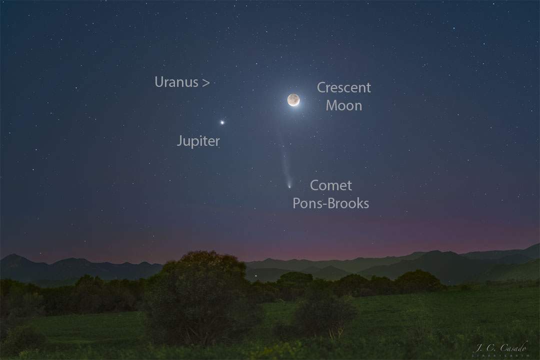 و اما مهمان اصلی این تصویر، دنبالهدار تناوبی ۱۲ با نام اختصاصی «پانز-بروکس» است که زیر ماه دیده میشود و دو دنباله زیبا از آن خارج شده است، یکی دنباله گردوغبار زردرنگ و دیگری دنباله یونی چشمنوازی که به سمت بالا کشیده شده است.