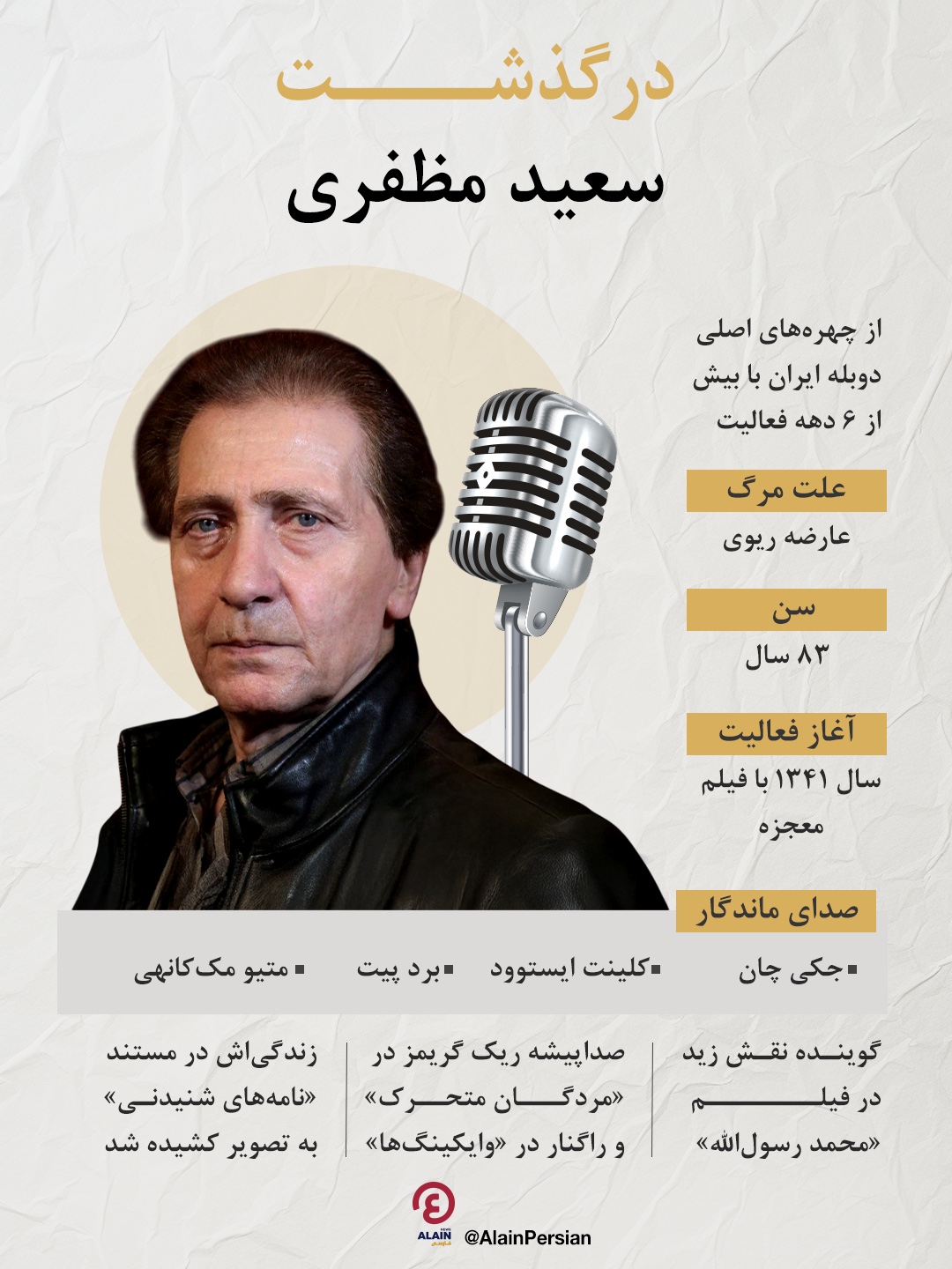 سعید مظفری، دوبلور برجسته و یکی از چهرههای ماندگار عرصه صداپیشگی ایران، در شامگاه ۲۲ مهر ۱۴۰۴ در سن ۸۳ سالگی در بیمارستان عرفان تهران بر اثر عارضه ریوی درگذشت.