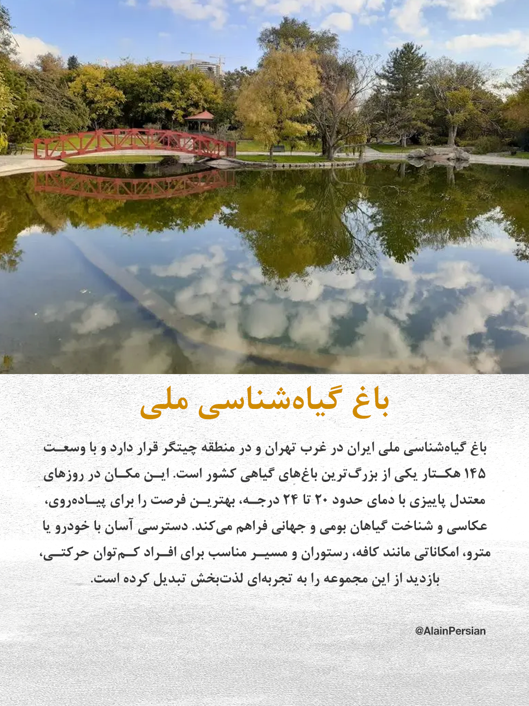 یکی از این مکانها، باغ گیاهشناسی ملی ایران است که در منطقه چیتگر قرار دارد. این باغ با وسعتی بیش از ۱۴۵ هکتار، مجموعهای بینظیر از گیاهان بومی و جهانی را در خود جای داده است. دمای معتدل ۲۰ تا ۲۴ درجه در روزهای پاییزی، این مکان را به گزینهای عالی برای پیادهروی و عکاسی تبدیل میکند. امکانات رفاهی مانند کافه، رستوران و مسیرهای مناسب برای افراد کمتوان حرکتی نیز در دسترس بازدیدکنندگان قرار دارد.