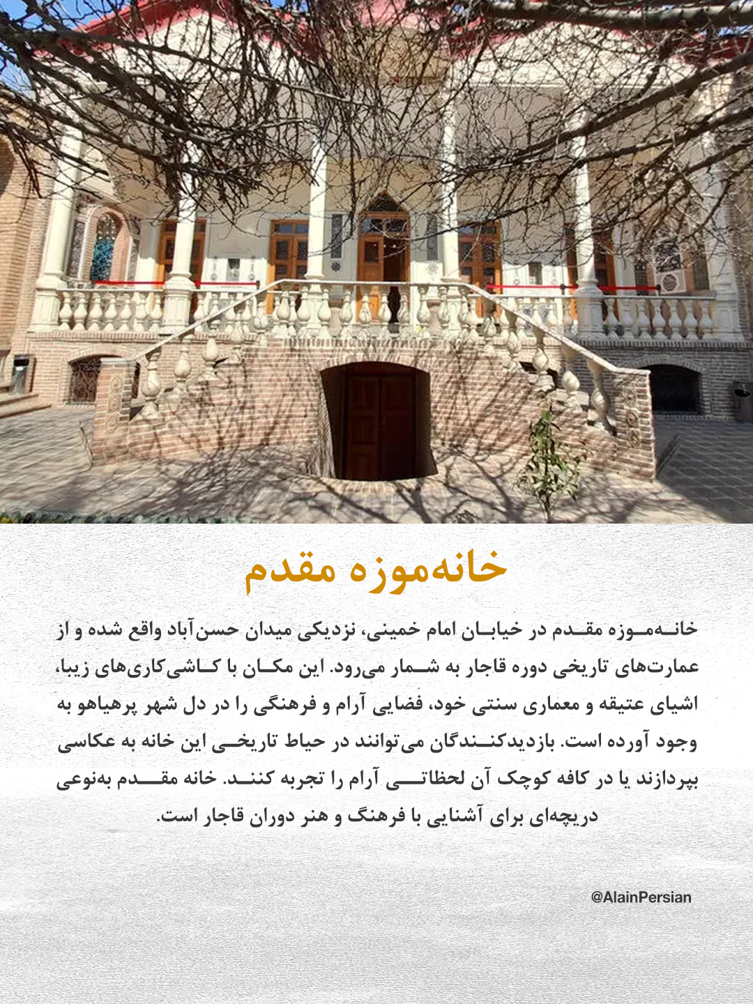 خانهموزه مقدم در خیابان امام خمینی نیز از دیگر مقاصد جذاب است. این عمارت قاجاری با کاشیکاریهای زیبا و اشیای عتیقهاش، فضایی آرام و فرهنگی را برای علاقهمندان به تاریخ ایجاد کرده است. بازدید از این مکان، فرصتی برای آشنایی با هنر و سبک زندگی قاجاری به شمار میرود و کافه کوچک آن محیطی دنج برای استراحت در میانه بازدید فراهم کرده است.