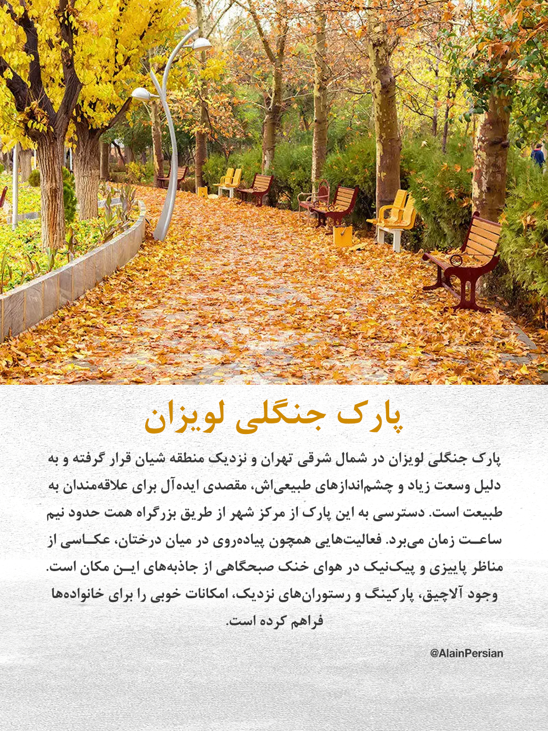 در شرق تهران، پارک جنگلی لویزان با وسعت قابل توجه و چشماندازهای طبیعیاش، مقصدی ایدهآل برای طبیعتدوستان است. دسترسی آسان از مرکز شهر و امکاناتی چون آلاچیق و رستوران، این پارک را به گزینهای مناسب برای خانوادهها تبدیل کرده است. پیادهروی در جنگلهای انبوه و عکاسی از مناظر پاییزی، از فعالیتهای محبوب در این مکان به شمار میرود.