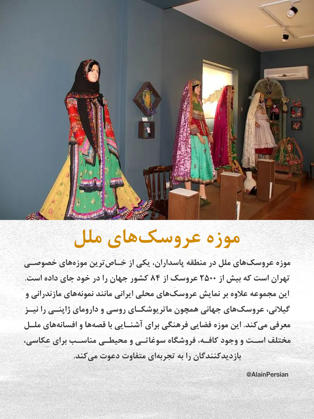 موزه عروسکهای ملل در منطقه پاسداران نیز یکی از خاصترین موزههای خصوصی تهران است. این مجموعه بیش از ۲۵۰۰ عروسک از ۸۴ کشور جهان را به نمایش گذاشته و فرهنگهای گوناگون را از طریق عروسکها معرفی میکند. دمی در این موزه سپری کردن، سفری به جهان قصهها و افسانههای ملل مختلف است و امکاناتی مانند کافه و فروشگاه سوغاتی نیز تجربه بازدید را کامل میکند.