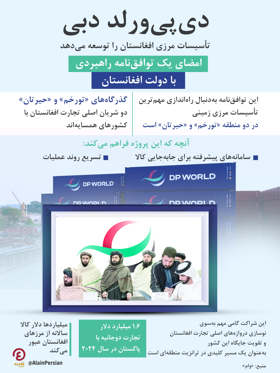 گروه دیپی ورلد دبی اعلام کرده است که با امضای توافقنامهای با دولت افغانستان، دو گذرگاه مهم «تورخم» و «حیرتان» را که از اصلیترین مبادی تجارت زمینی این کشور با همسایگان بهشمار میروند، توسعه و اداره خواهد کرد.