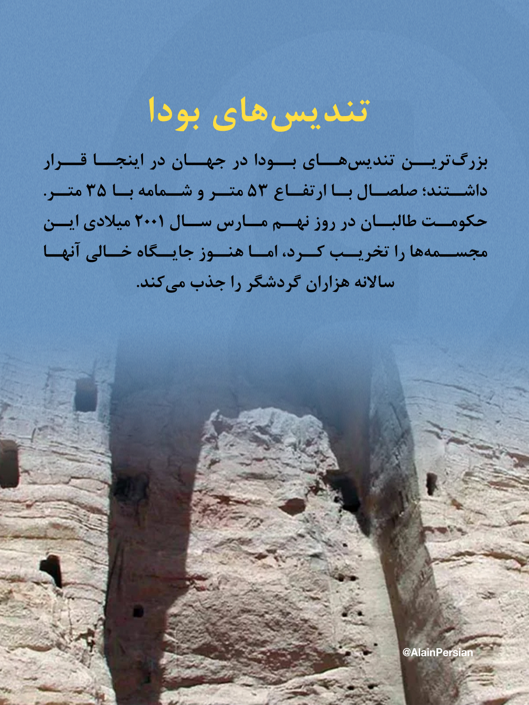 دره بامیان میزبان بزرگترین مجسمههای بودا در جهان بود که یکی ۵۳ متر و دیگری ۳۵ متر ارتفاع داشت. طالبان در دوره قبلی خود آنها را ویران کردند، اما دو حفره صخرهای همچنان گردشگران را جذب میکند. بر اساس افسانه محلی، این مجسمهها یادگار عشق «صلصال» و «شمامه» هستند. بازدید از این محل با بلیت ۵۰۰ افغانی، معادل ۳٫۵ دلار امکانپذیر است.