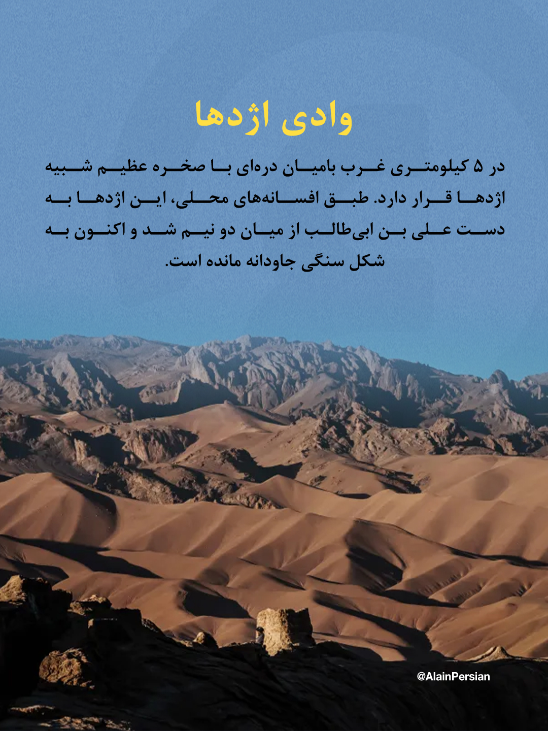 یکی دیگر از جاذبهها «وادی اژدها» است که در ۵ کیلومتری غرب بامیان قرار دارد. صخرهای عظیم با شکاف میانی به شکل اژدها، همراه با چشمه آب شور، به افسانهای محلی نسبت داده میشود که در «خاوراننامه» بازگو شده است.