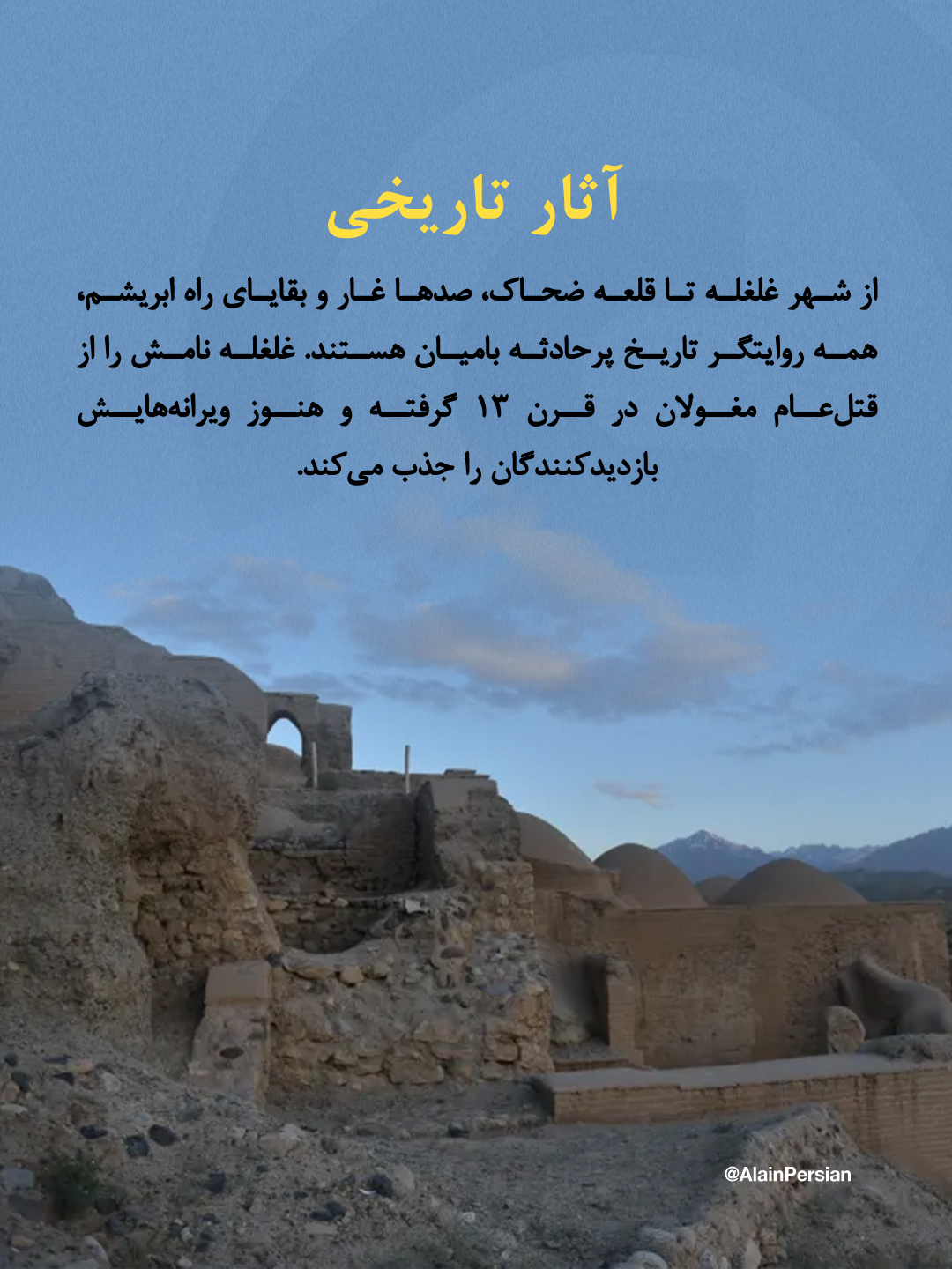 از نظر تاریخی نیز بامیان جایگاه ویژهای دارد. این منطقه در مسیر جاده ابریشم قرار داشته و آثار متعددی از تمدنهای یونانی، غزنوی و مغولی در آن باقی مانده است. شهرهای تاریخی «غلغله»، «ضحاک» و «خان» از مهمترین مکانهای دیدنی به شمار میروند.
