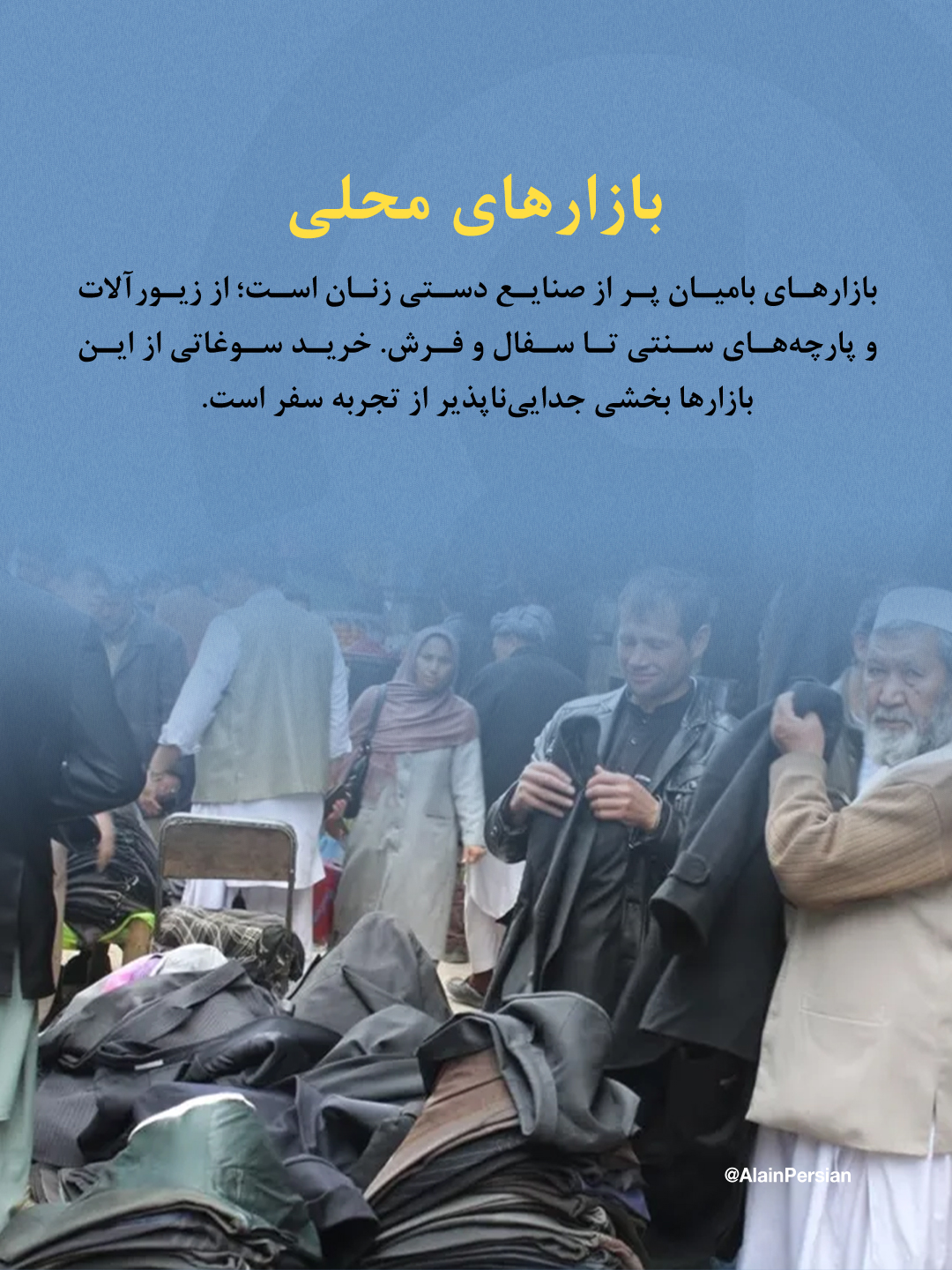 بازارهای سنتی بامیان نیز پر از صنایع دستی زنان محلی مانند قالیچه، گلیم، سفال و لباسهای محلی است. در زمستان، برف ششماهه کوهستانها این استان را به مرکز ورزشهای زمستانی بهویژه اسکی در دامنههای «کوه بابا» تبدیل میکند.
