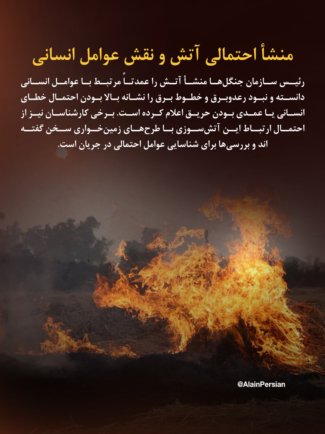 رئیس سازمان جنگلها و مراتع منشأ آتش را غالباً مرتبط با عوامل انسانی دانسته و با اشاره به نبود رعدوبرق و خطوط برق در محدوده حادثه، احتمال خطای انسانی یا عمدی بودن حریق را بالا ارزیابی کرده است. همزمان برخی کارشناسان و منابع محلی احتمال ارتباط این آتشسوزی با طرحهای زمینخواری را نیز مطرح کردهاند و بررسیها برای شناسایی عوامل احتمالی تصرف غیرقانونی زمین در جریان است.