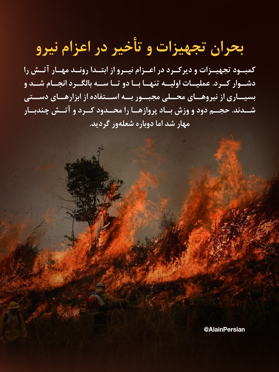 کمبود تجهیزات و دیرکرد در اعزام نیرو از همان ساعات نخست حادثه چالشهای جدی ایجاد کرد. گزارشها حاکی است عملیات اولیه تنها با دو تا سه بالگرد پیش رفت و بسیاری از نیروهای محلی و امدادی ناچار به استفاده از ابزارهای دستی شدند. شدت دود و وزش باد، پرواز بالگردها را محدود کرد و آتشسوزی چندبار مهار و سپس با وزش باد دوباره شعلهور شد. ساکنان محلی با بیل و ابزار ابتدایی برای مهار آتش به ارتفاعات رفتند، اما نبود امکانات کافی امکان کنترل سریع حریق را از میان برد.