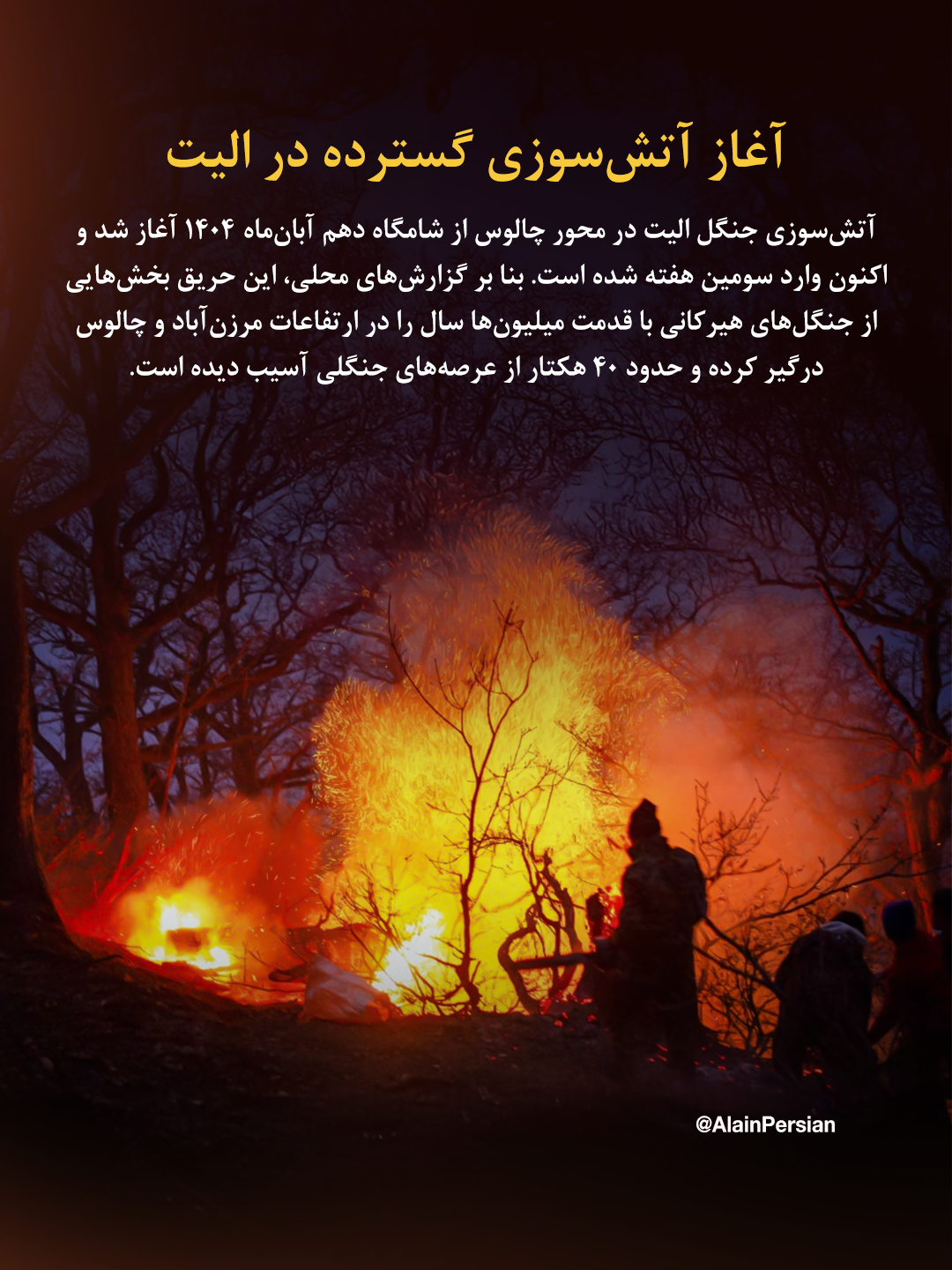 آتشسوزی جنگل الیت در محور چالوس که از شامگاه دهم آبانماه سال ۱۴۰۴ آغاز شده، همچنان ادامه دارد و بنا بر گزارشهای محلی بخشهایی از جنگلهای هیرکانی با قدمت میلیونها سال را در ارتفاعات اطراف مرزنآباد و چالوس درگیر کرده است.