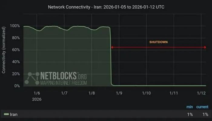 دادههای گروه رصد اینترنت «نتبلاکس» نشان میدهد که اتصال اینترنت در ایران از شامگاه ۸ ژانویه ۲۰۲۶ تا ۱۲ ژانویه ۲۰۲۶ به وقت گرینویچ تقریبا به صفر رسیده و دسترسی ملی به حدود یک درصد سطح عادی کاهش یافته است.
