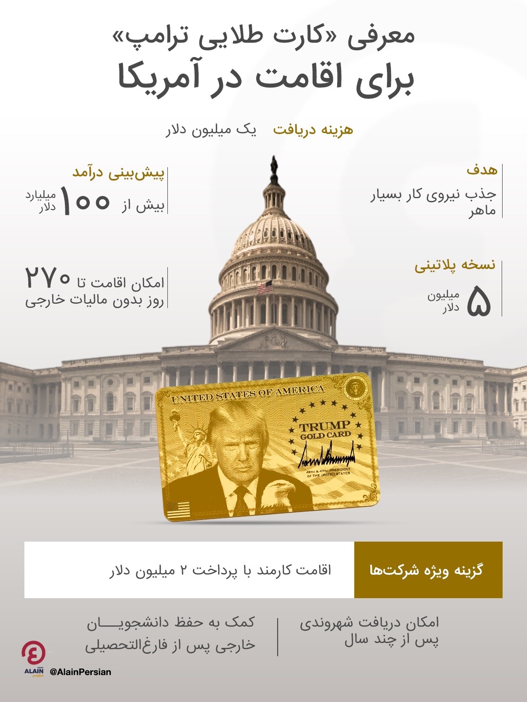دولت ایالات متحده تحت رهبری دونالد ترامپ برنامهای تازه با عنوان «کارت طلایی ترامپ» معرفی کرده که به شهروندان خارجی ثروتمند امکان دریافت اقامت آمریکا را در ازای پرداخت مبلغی قابل توجه میدهد.