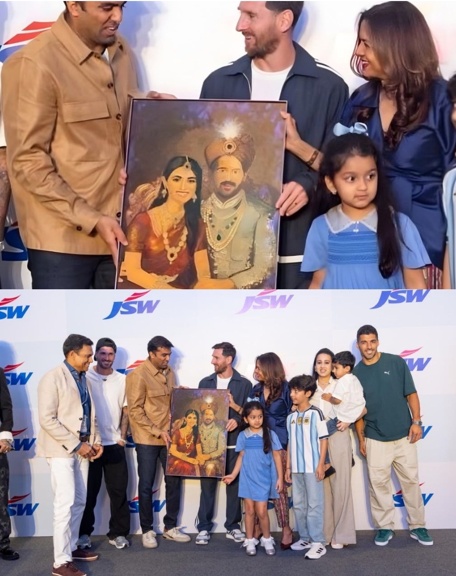 در جریان این دیدار، نمایندگان گروه JSW یک تابلوی هنری قابشده به مسی اهدا کردند که در آن، لیونل مسی و همسرش آنتونلا روکوتزو با الهام از فرهنگ هند به تصویر کشیده شده بودند. در این اثر هنری، این زوج مشهور در لباسهای سنتی هندی دیده میشوند؛ تصویری که ترکیبی از هنر بومی، احترام فرهنگی و علاقه عمیق هندیها به ستاره آرژانتینی فوتبال را به نمایش میگذاشت. این هدیه متفاوت، لبخند و واکنش صمیمانه مسی را به همراه داشت و به یکی از لحظات بهیادماندنی سفر او تبدیل شد.