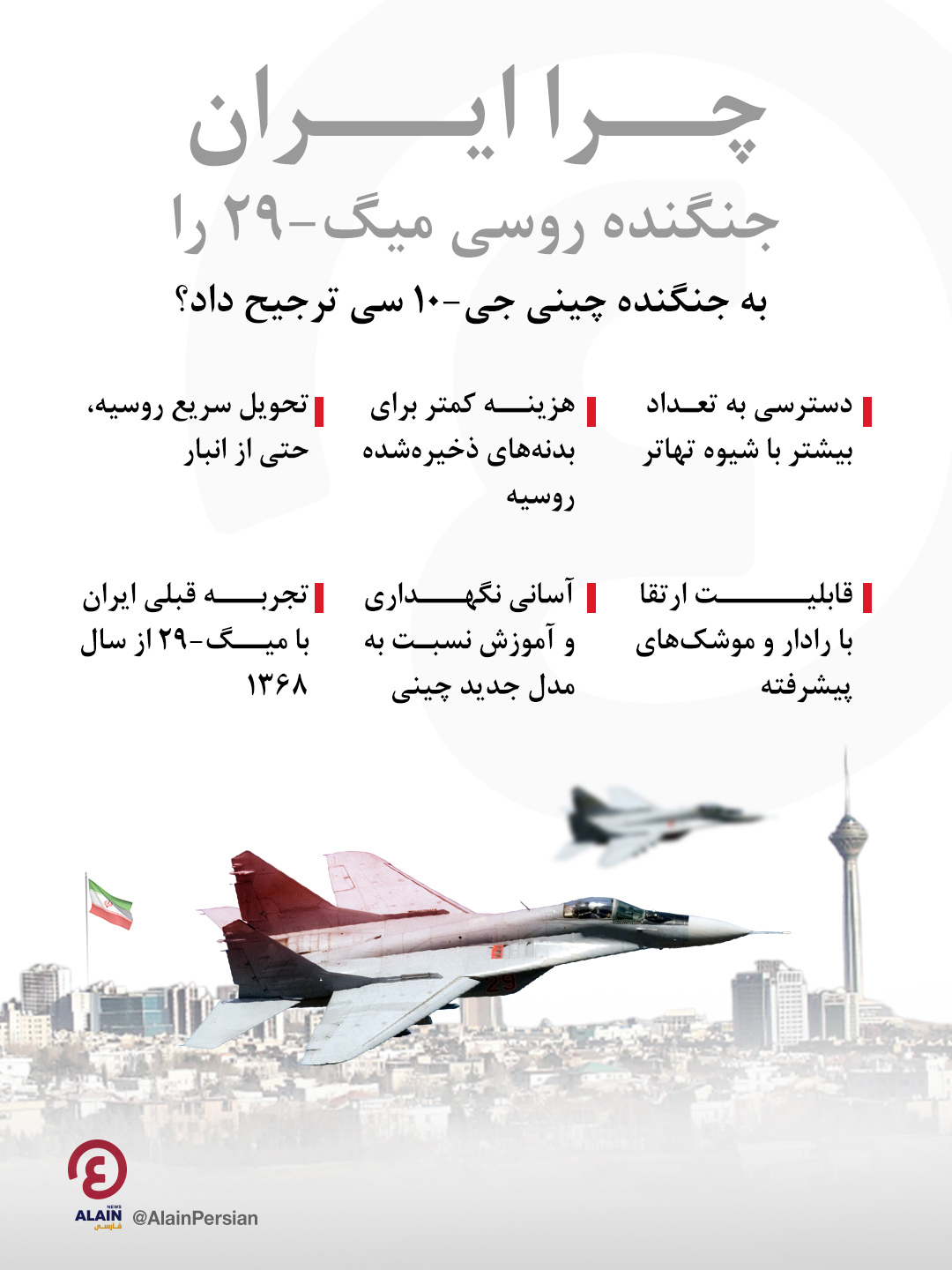 در ماههای گذشته مقامهای ایرانی از قراردادهایی برای خرید جنگندههای سوخو-۳۵ خبر داده بودند و بسیاری انتظار داشتند برنامه نوسازی شامل هواپیمای چینی جی-۱۰ سی نیز شود. این مدل چینی با وزن کمتر، هزینه پایینتر در عملیات و مزایایی همچون سامانههای حسگر پیشرفته و مواد ساخت مدرن شناخته میشود. با این حال، انتخاب تهران بهسوی میگ-۲۹ که بهظاهر قدیمیتر و کمتر توسعهیافته است، شگفتی و تحلیلهای متعددی را برانگیخته است.