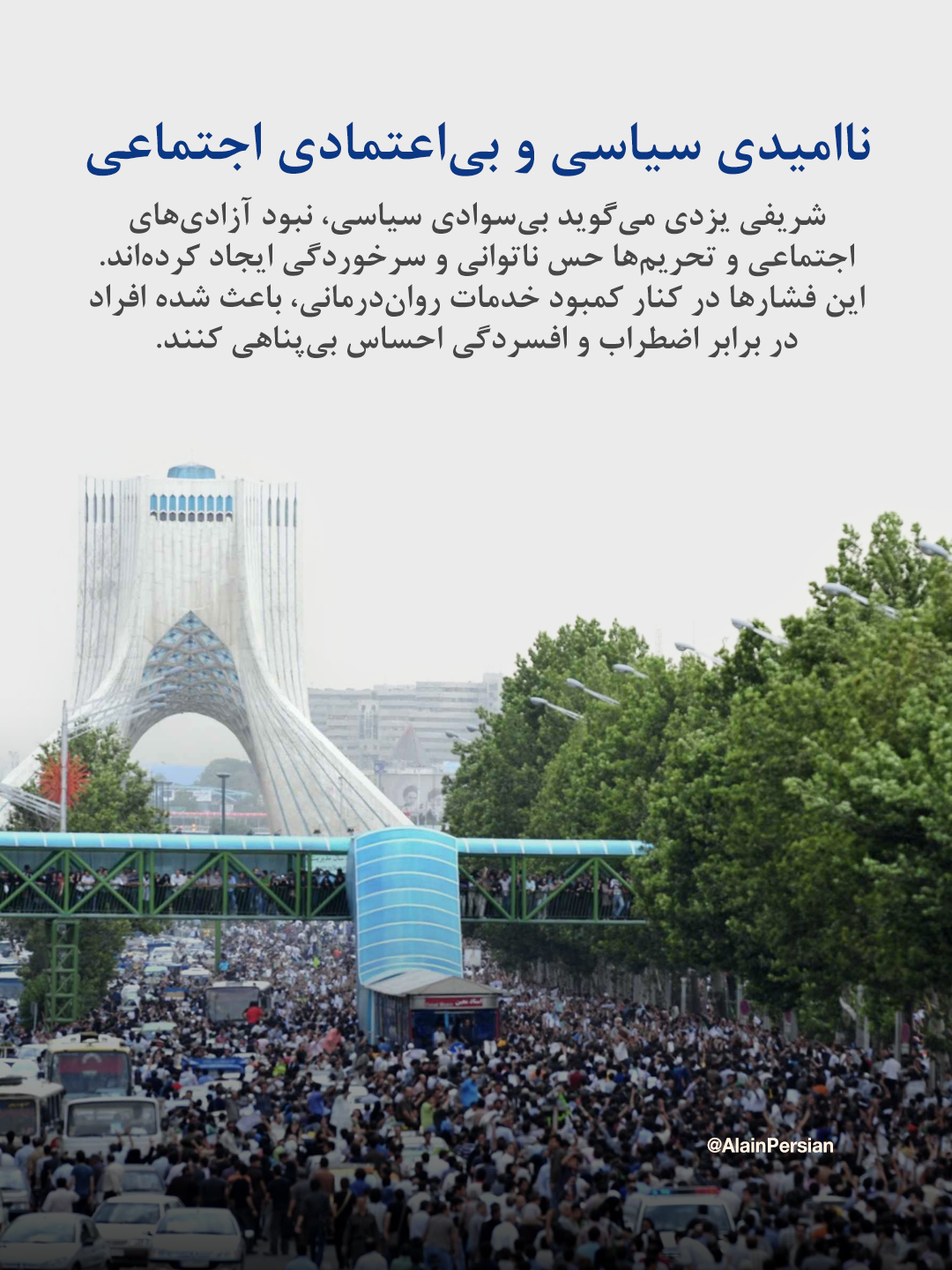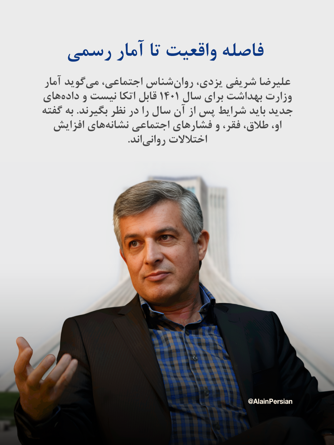 علیرضا شریفی یزدی، جامعهشناس و روانشناس اجتماعی، در گفتوگو با فرارو تأکید کرده است که دادههای وزارت بهداشت مربوط به سال ۱۴۰۱ بوده و شرایط سه سال اخیر، شامل بحرانهای اقتصادی، اجتماعی و سیاسی، این آمار را بهشدت افزایش داده است. به گفته او، طلاق، فقر، فشارهای اجتماعی و ناامیدی سیاسی، همگی نشانههایی از رشد اختلالات روانی در جامعهاند.