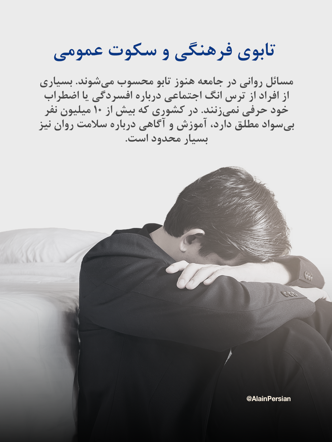 این کارشناس با اشاره به ضعف آموزش عمومی درباره سلامت روان گفته است: «در جامعهای که بیش از ۱۰ میلیون نفر بیسواد مطلق دارد، آموزش مؤثر درباره بیماریهای روانی بسیار محدود است. تابو بودن مسائل روانی باعث میشود بسیاری از افراد از ترس قضاوت دیگران درباره افسردگی یا اضطراب خود سکوت کنند.»