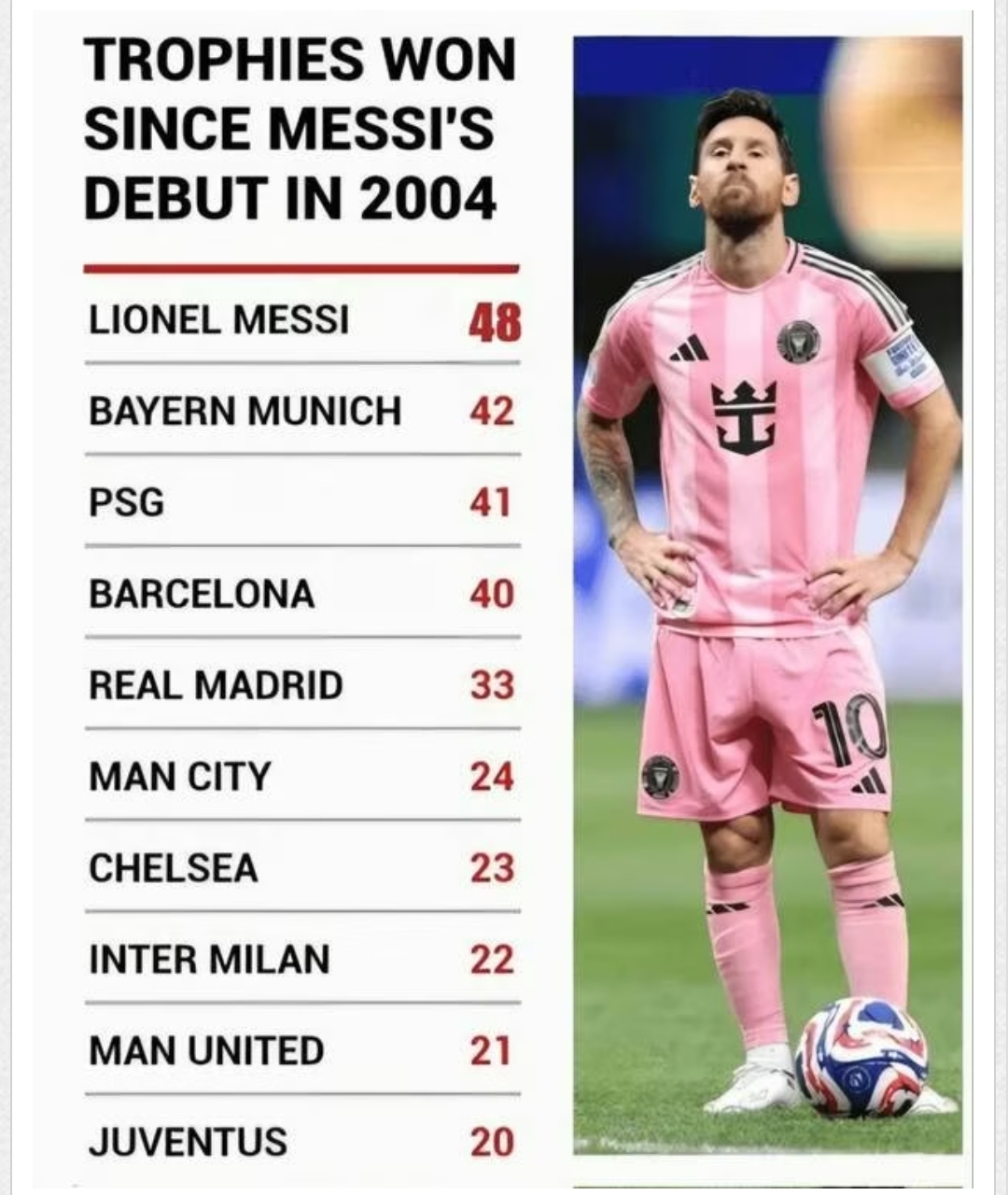 این مقایسه نشان میدهد که تعداد جامهای کسبشده توسط یک بازیکن، اکنون از مجموع قهرمانی بسیاری از تیمهای بزرگ جهان بیشتر است؛ موضوعی که مسی را به پدیدهای تاریخی و استثنایی تبدیل کرده است. بسیاری از کارشناسان باور دارند که با روند فعلی، این رکورد در سالهای آینده باز هم افزایش خواهد یافت و فاصله مسی با سایرین بیش از پیش خواهد شد.