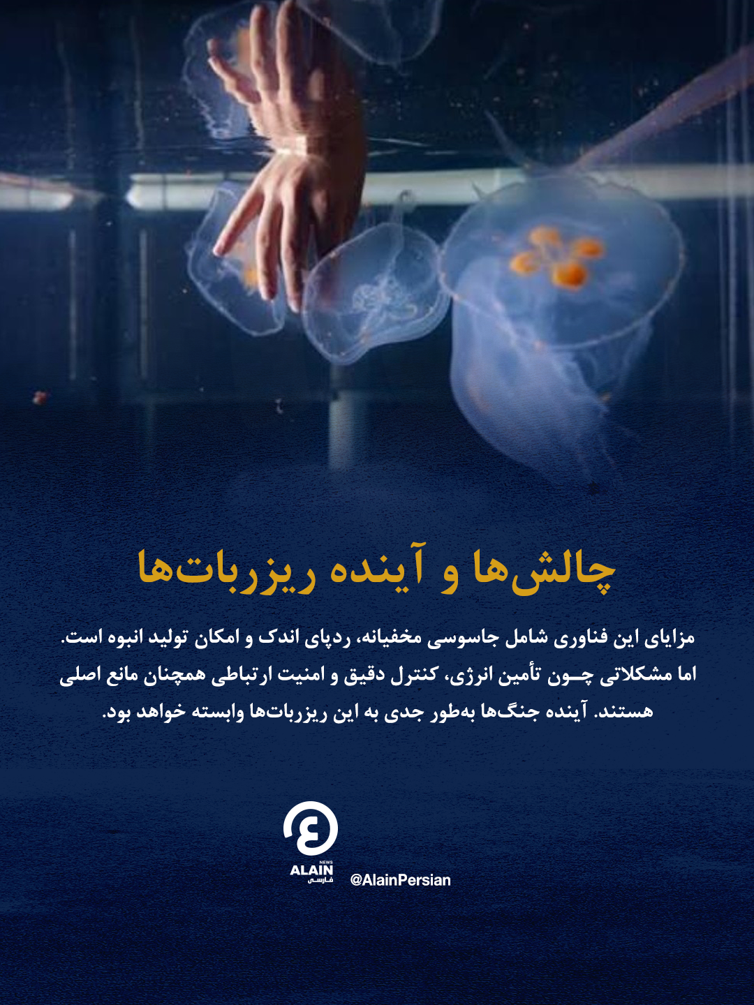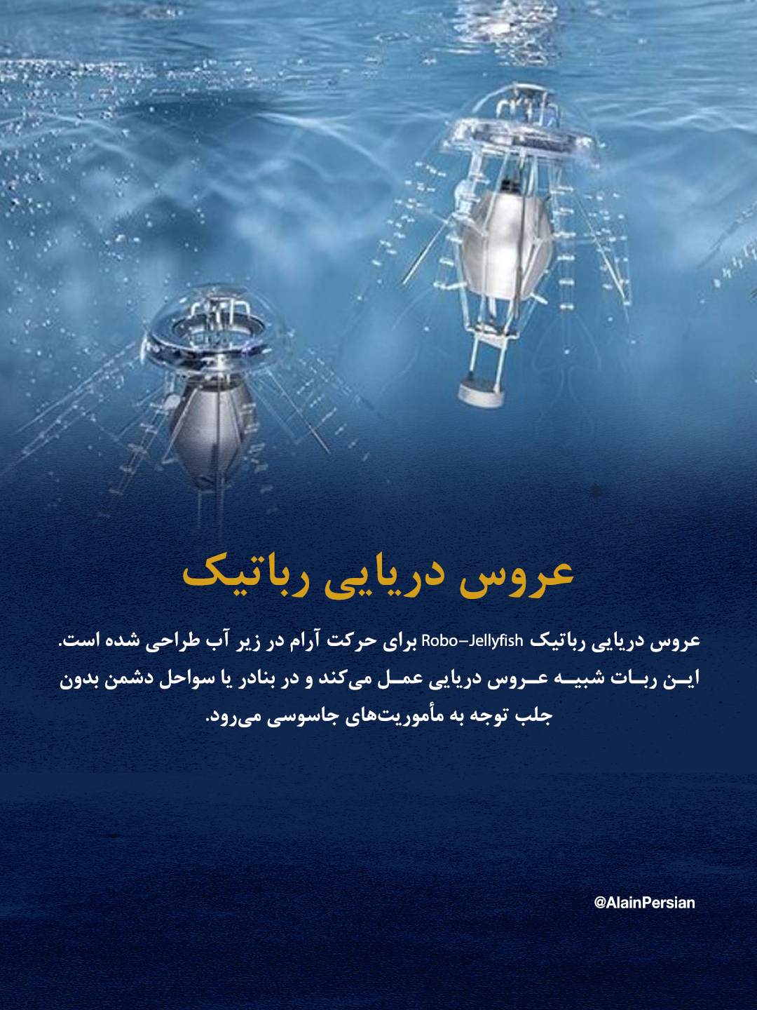 در حوزه زیرآب نیز پروژههایی در جریان است. رباتی به نام Robo-Jellyfish با تقلید از حرکات آرام و نرم عروسهای دریایی ساخته شده تا در آبهای ساحلی یا بنادر دشمن بدون جلب توجه حرکت کند. این رباتها میتوانند برای جاسوسی و نظارت بر فعالیتهای دریایی مورد استفاده قرار گیرند.