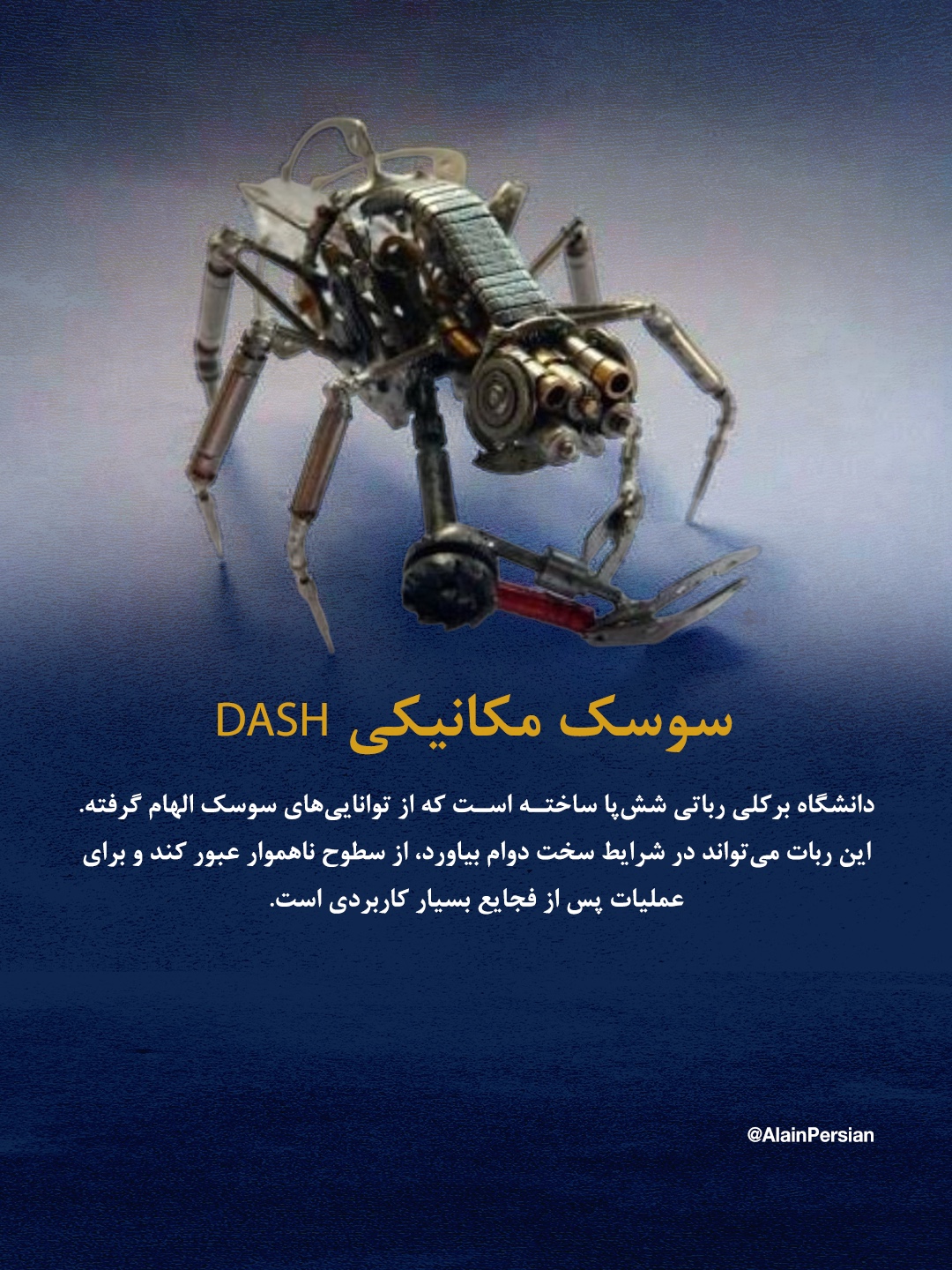 نمونههای دیگری نیز بر پایه حشرات زمینی طراحی شدهاند. در دانشگاه برکلی آمریکا، رباتی به نام DASH ساخته شده که ظاهر و حرکت آن به سوسک شباهت دارد. این ربات میتواند از سطوح ناهموار عبور کند و فشار یا لرزشهای شدید را تحمل کند. چنین ویژگیهایی آن را برای عملیات در شرایط بحرانی یا پس از فجایع طبیعی کارآمد میسازد.