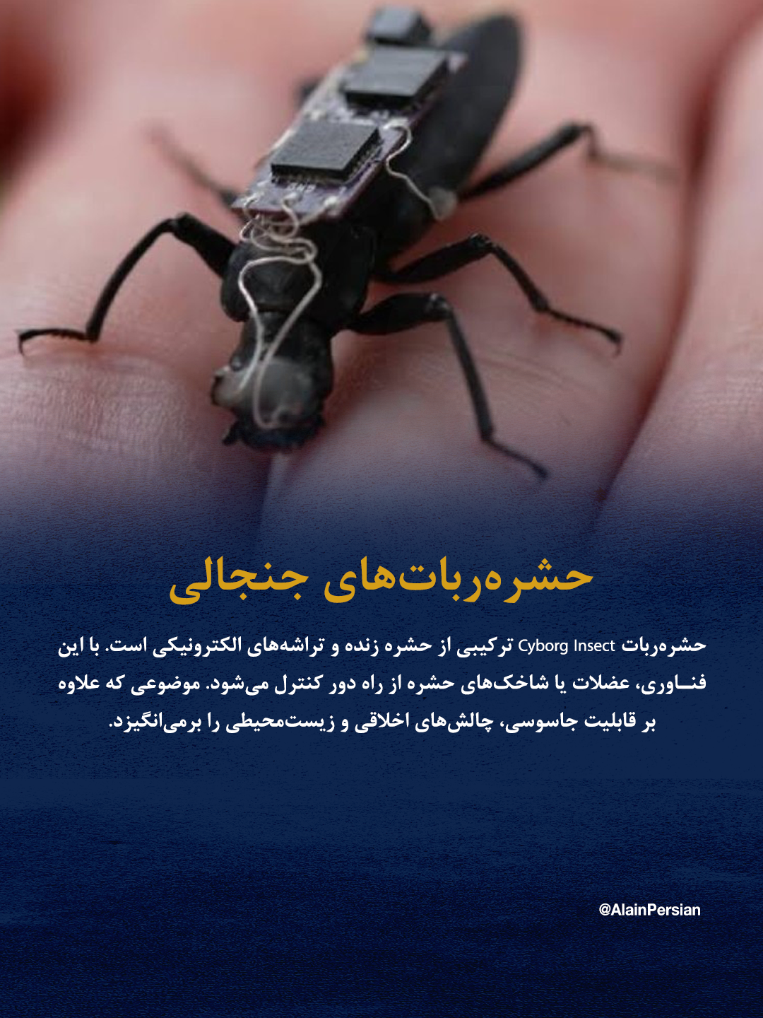 یکی از بحثبرانگیزترین مفاهیم در این حوزه، حشرهرباتها یا همان Cyborg Insects هستند. در این فناوری، دانشمندان تراشهها و میکروکنترلرها را داخل بدن حشرات زنده مانند پروانه یا شپشک قرار میدهند تا پس از رشد کامل، بتوان حرکات عضلات یا شاخکهایشان را کنترل کرد. این موضوع اگرچه میتواند تحولی در ابزارهای جاسوسی ایجاد کند، اما پرسشهای اخلاقی و زیستمحیطی عمیقی را نیز به همراه دارد.