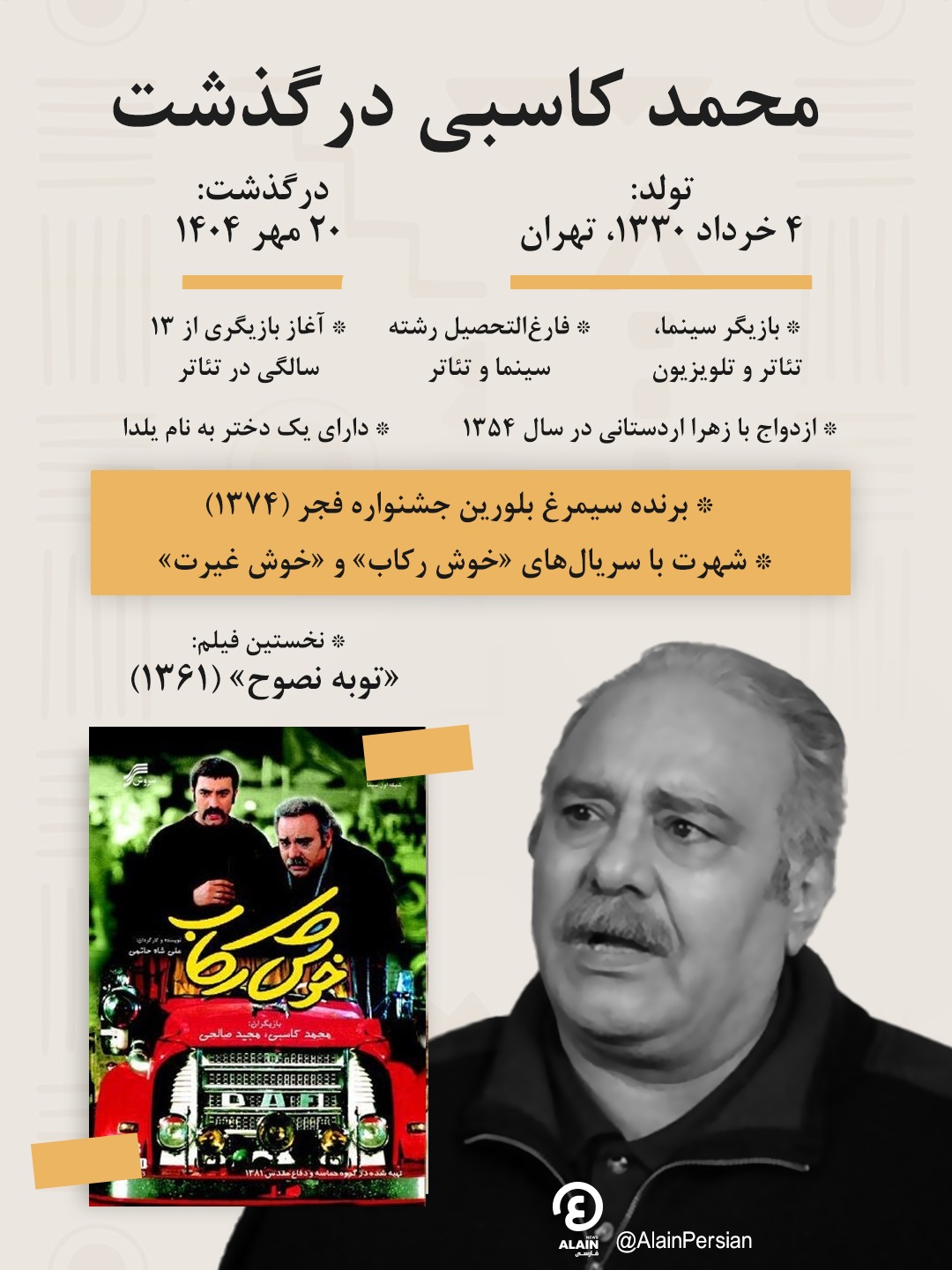 محمد کاسبی، بازیگر پیشکسوت سینما، تئاتر و تلویزیون ایران، روز ۲۰ مهر ۱۴۰۴ پس از مدتها بستری بودن در بخش مراقبتهای ویژه بیمارستان خاتمالانبیا در تهران، درگذشت.