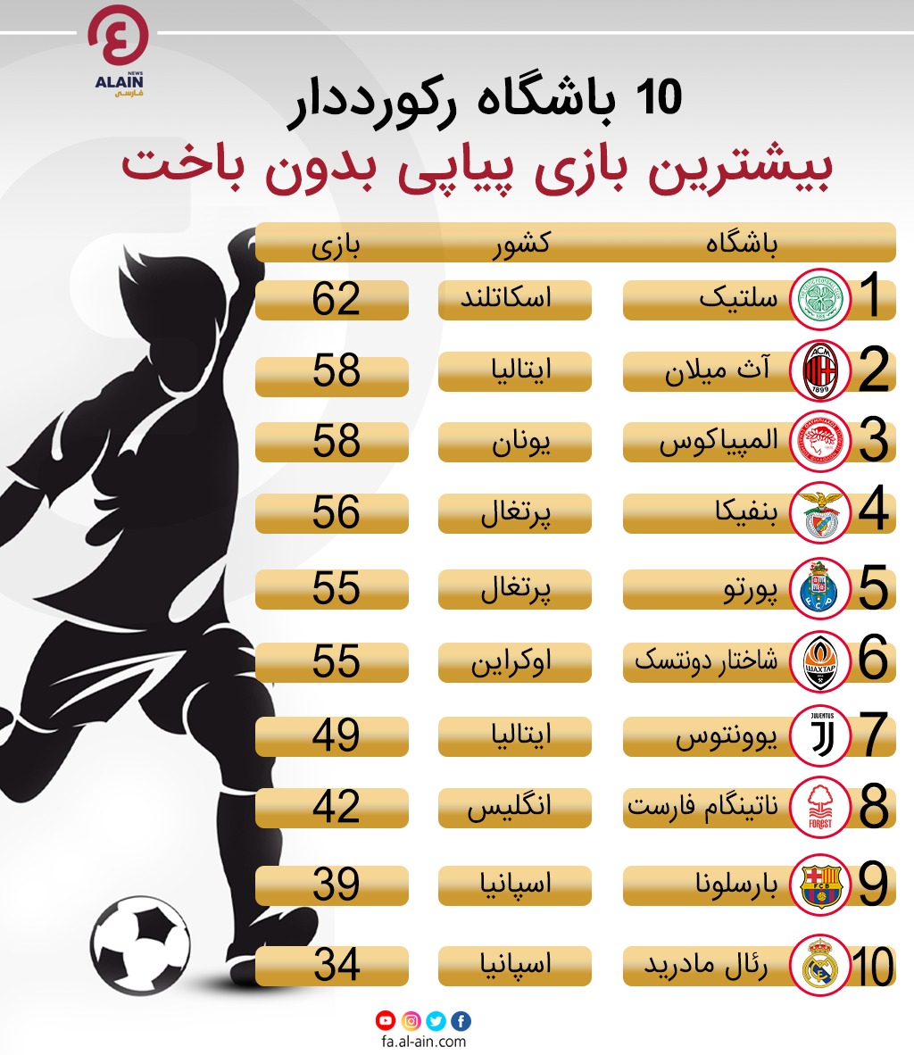 اینفوگرافیک | ۱۰ باشگاه رکورددار بیشترین بازی پیاپی بدون باخت