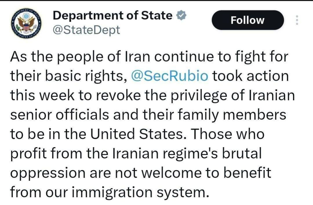 در این پیام با اشاره به شرایط داخلی ایران تأکید شده است که همزمان با ادامه تلاش مردم برای دستیابی به حقوق اساسی خود، دولت آمریکا اقدام به لغو امتیاز ورود مقامات ارشد ایرانی و خانوادههای آنها به ایالات متحده کرده است. بر اساس این موضعگیری، واشنگتن معتقد است افرادی که به گفته مقامهای آمریکایی از «سرکوب و رفتارهای خشونتآمیز» در ایران سود میبرند، نباید امکان سفر یا اقامت در آمریکا را داشته باشند.