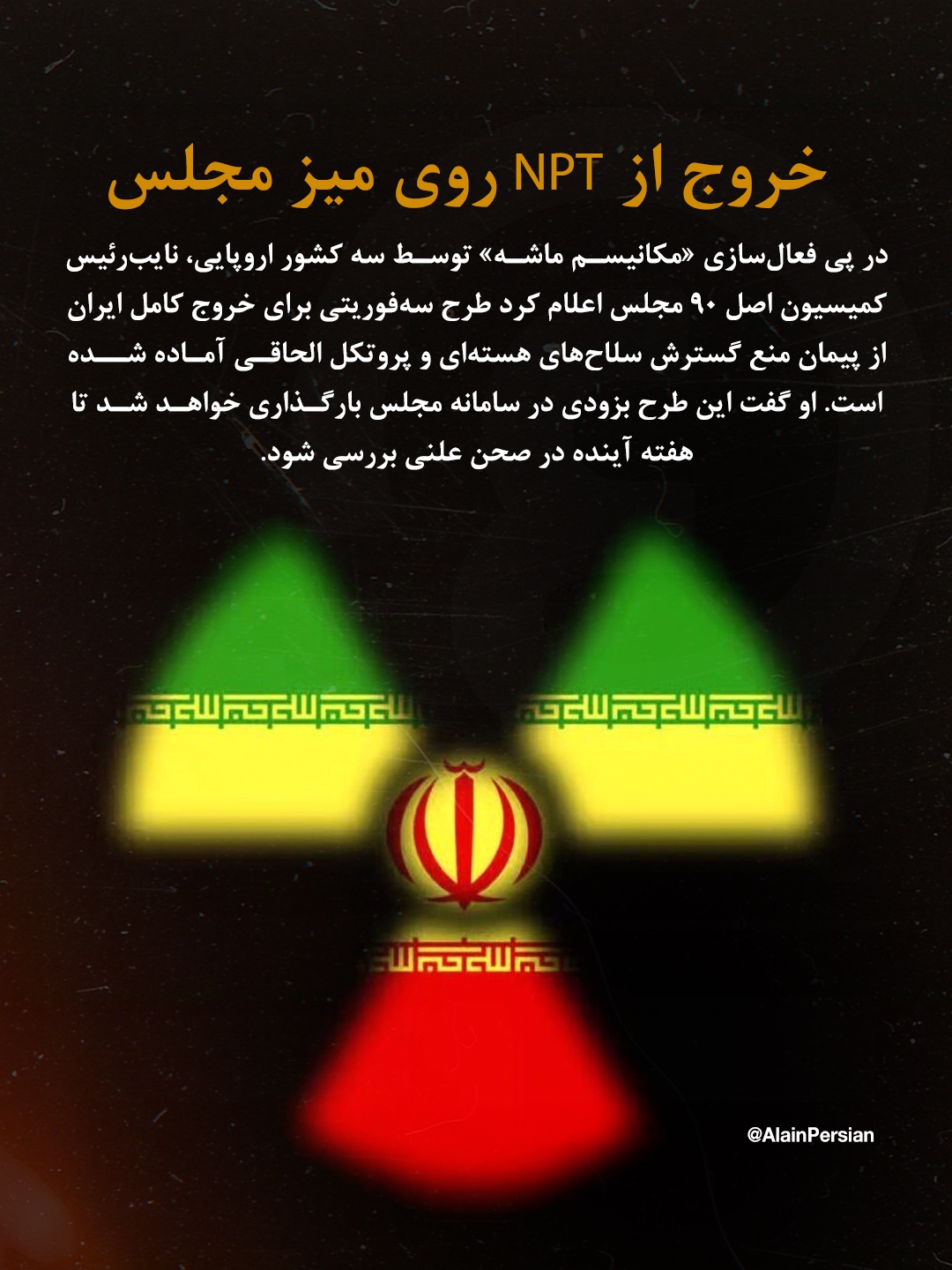 در پی فعالسازی «مکانیسم ماشه» توسط سه کشور اروپایی، یک نماینده مجلس شورای ایران روز پنجشنبه (۶ شهریور)، از تهیه طرح سه فوریتی خروج کامل ایران از پیمان بینالمللی منع گسترش سلاحهای هستهای (انپیتی) و پروتکل الحاقی خبر داده است.
