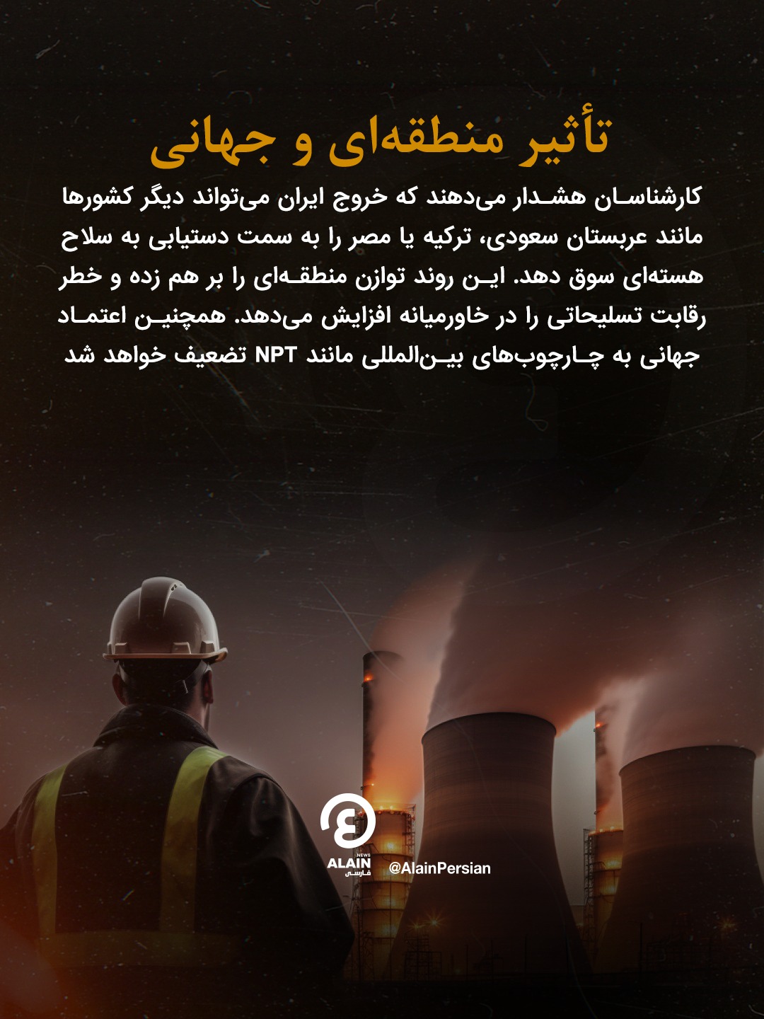 درعین حال با خروج ایران، کشورهایی مانند عربستان سعودی، ترکیه یا مصر ممکن است برای جبران و حفظ توازن منطقهای به دستیابی به سلاح هستهای تمایل پیدا کنند؛ روندی که خطر گسترش تسلیحات هستهای در خاورمیانه را افزایش میدهد.