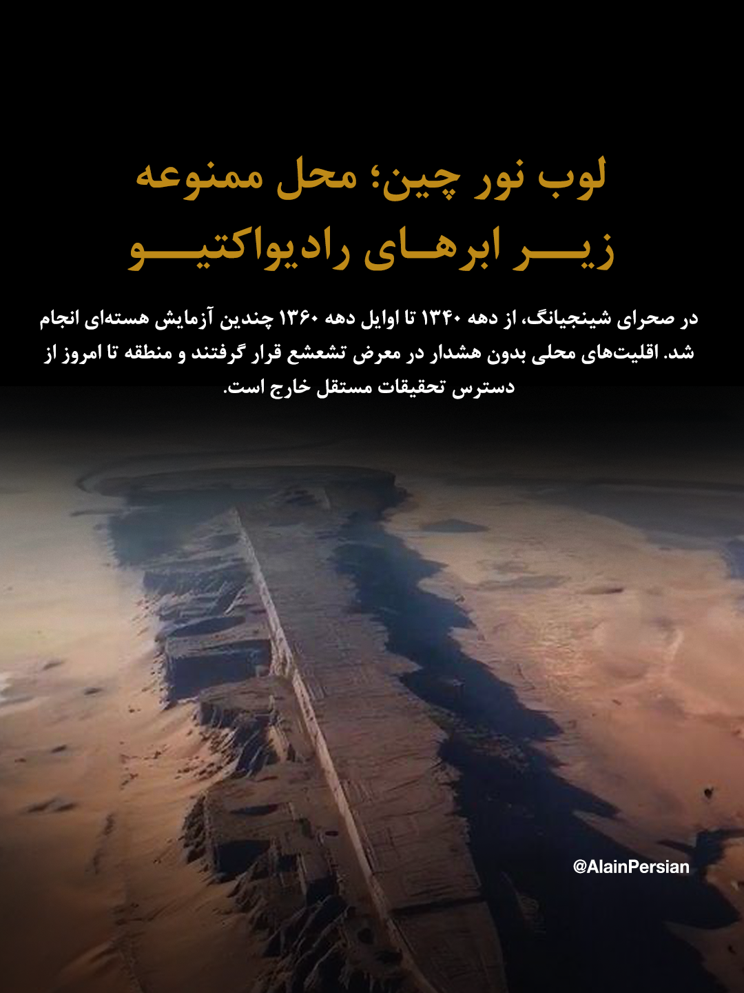 در صحرای «شینجیانگ» چین، محل آزمایش «لوب نور» از دهه ۱۳۴۰ تا اوایل دهه ۱۳۶۰ شاهد مجموعهای از انفجارهای هستهای بود که آثار آن به جامعههای محلی، بهویژه اقلیتهای قومی، سرایت کرد. این منطقه هنوز از دسترس پژوهشگران مستقل خارج است و اطلاعات موجود درباره پیامدها بسیار محدود است.