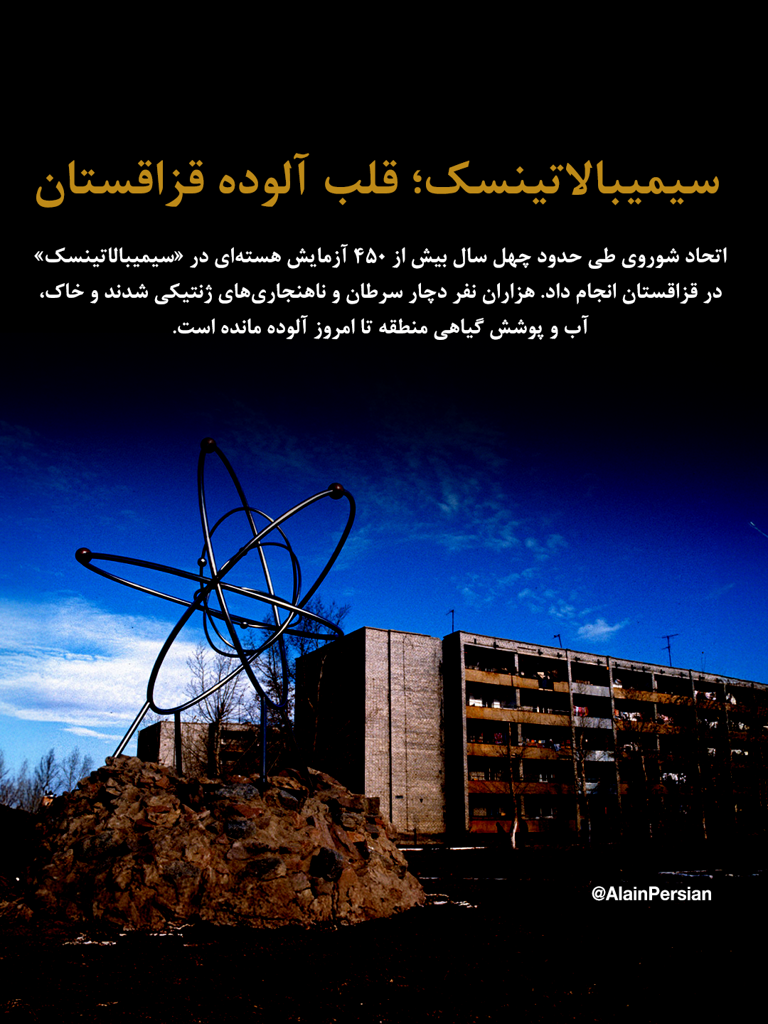 در شمال شرق قزاقستان، منطقه «سیمیبالاتینسک» یکی از آلودهترین نقاط جهان به مواد رادیواکتیو شناخته میشود. اتحاد جماهیر شوروی طی حدود چهل سال، بیش از ۴۵۰ آزمایش هستهای در این منطقه انجام داد که بسیاری از آنها در فضای باز بود. ساکنان روستاهای اطراف دچار انواع سرطان و ناهنجاریهای ژنتیکی شدند و آثار اشعه تا نسلهای بعد ادامه یافت. با وجود تعطیلی محل، قزاقستان همچنان با پیامدهای انسانی و زیستمحیطی گسترده این آزمایشها روبهرو است.